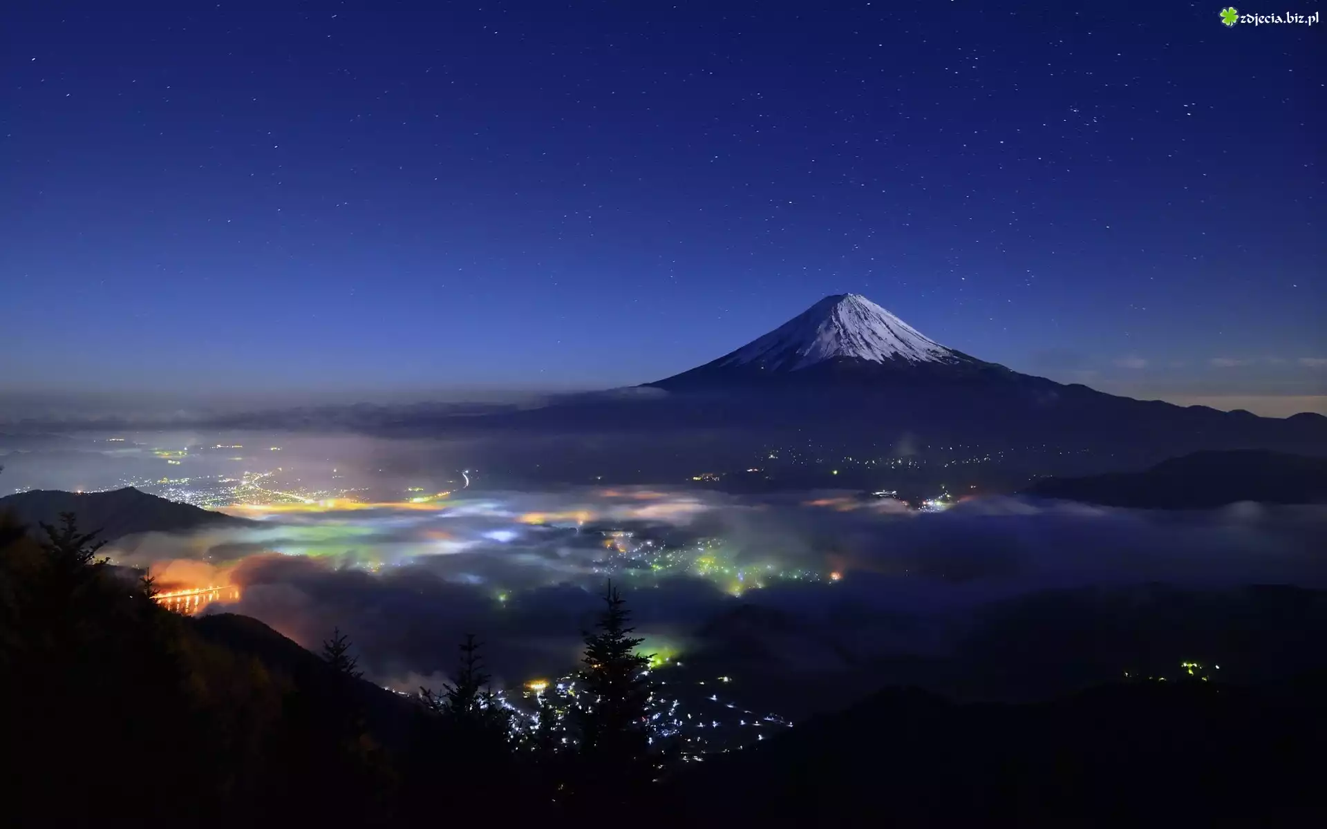 Zdjęcie Japonia, Wulkan, Fudżi, Noc, Miasto, Mgła, Drzewa