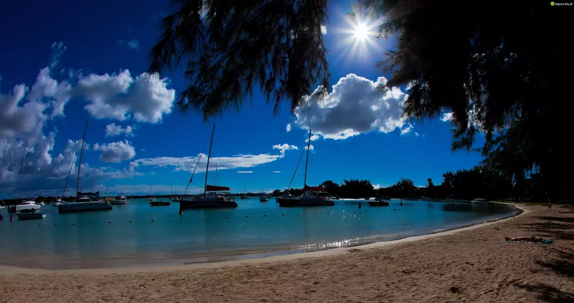 Zdjęcie, Wybrzeże, Łodzie, Chmury, Promienie słońca, Żaglówki, Plaża