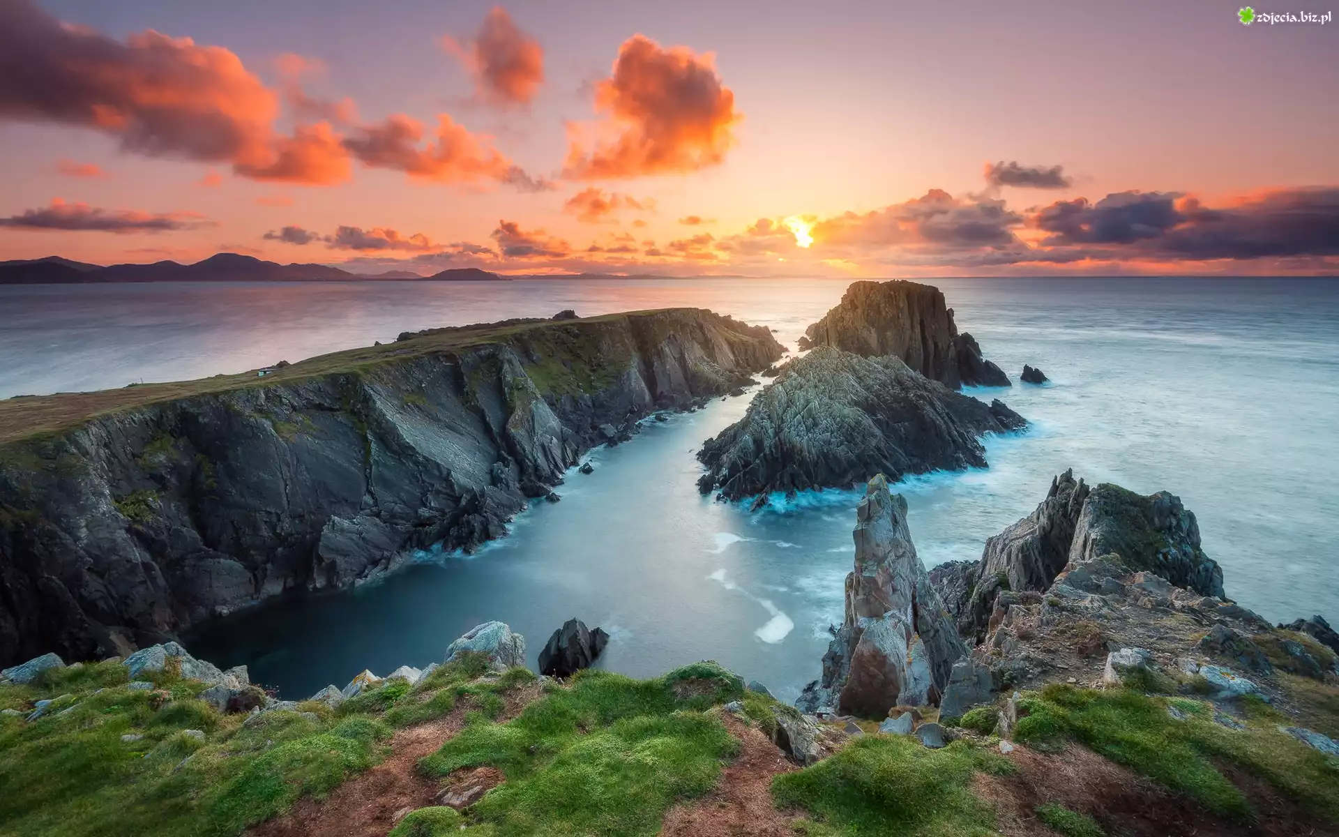 Zdjęcie Wybrzeże, Skały, Morze, Niebo, Trawa, Chmury, Kamienie, Zachód słońca