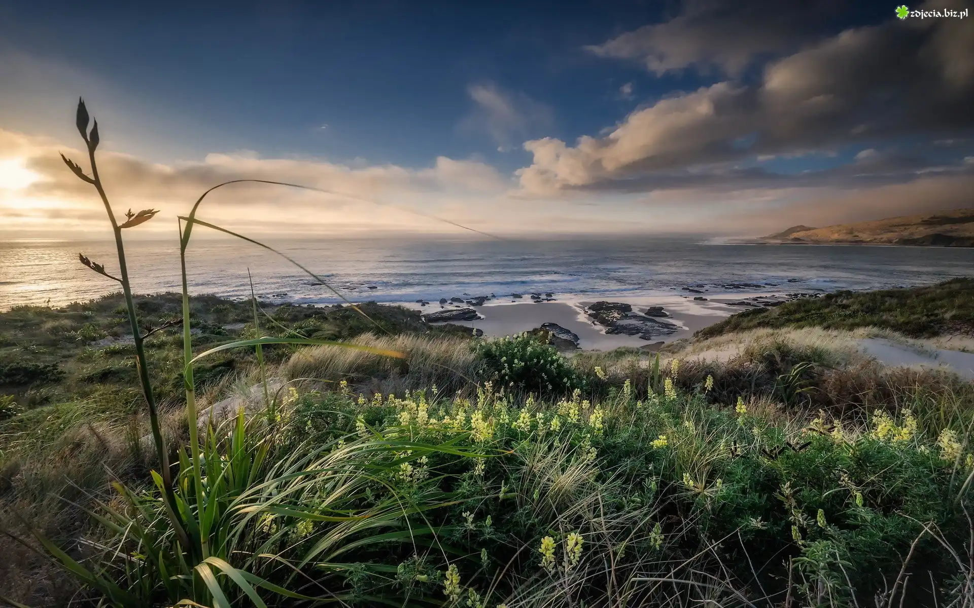 Zdjęcie Wybrzeże, Trawy, Kwiaty, Góry