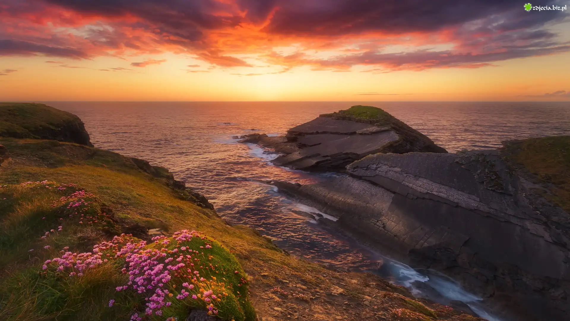 Zdjęcie Morze, Wybrzeże, Kwiaty, Zachód słońca, Chmury, Skały