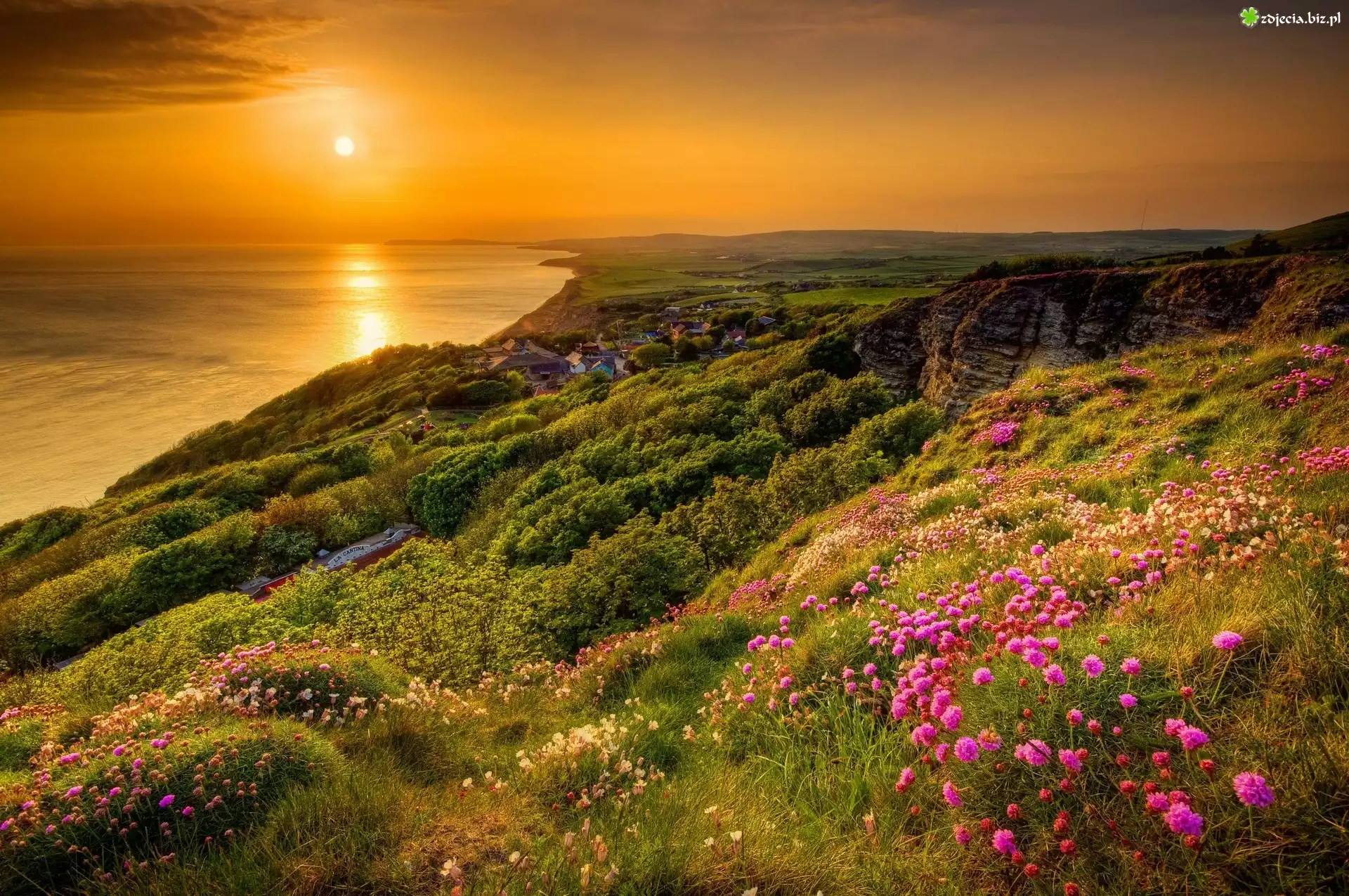 Zdjęcie Wybrzeże, Roślinność, Łąka, Zachód słońca, Morze
