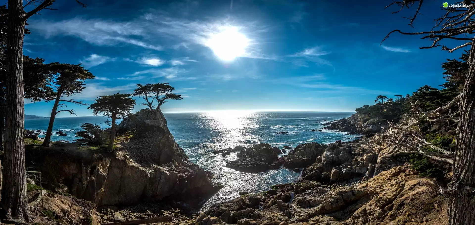 Zdjęcie Stany Zjednoczone, Stan Kalifornia, Wybrzeże, Pebble Beach, Morze, Skały, Lone Cypress, Drzewa, Promienie słońca |