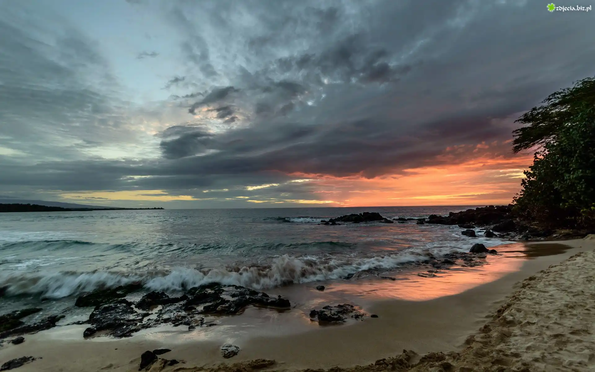 Zdjęcie Wybrzeże, Plaża, Kamienie, Fale, Zachód, Słońca
