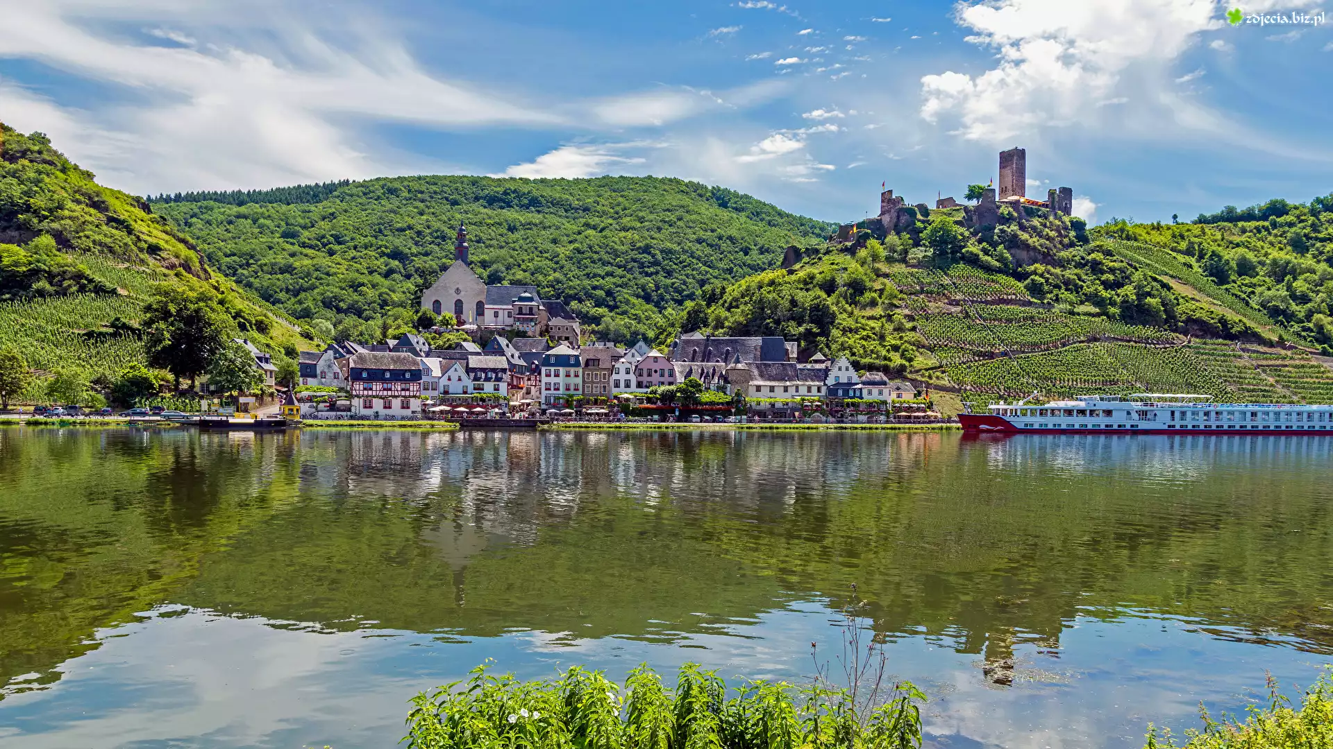 Zdjęcie Domy, Miasteczko, Rzeka, Wzgórza, Las, Drzewa, Ruiny, Statek wycieczkowy