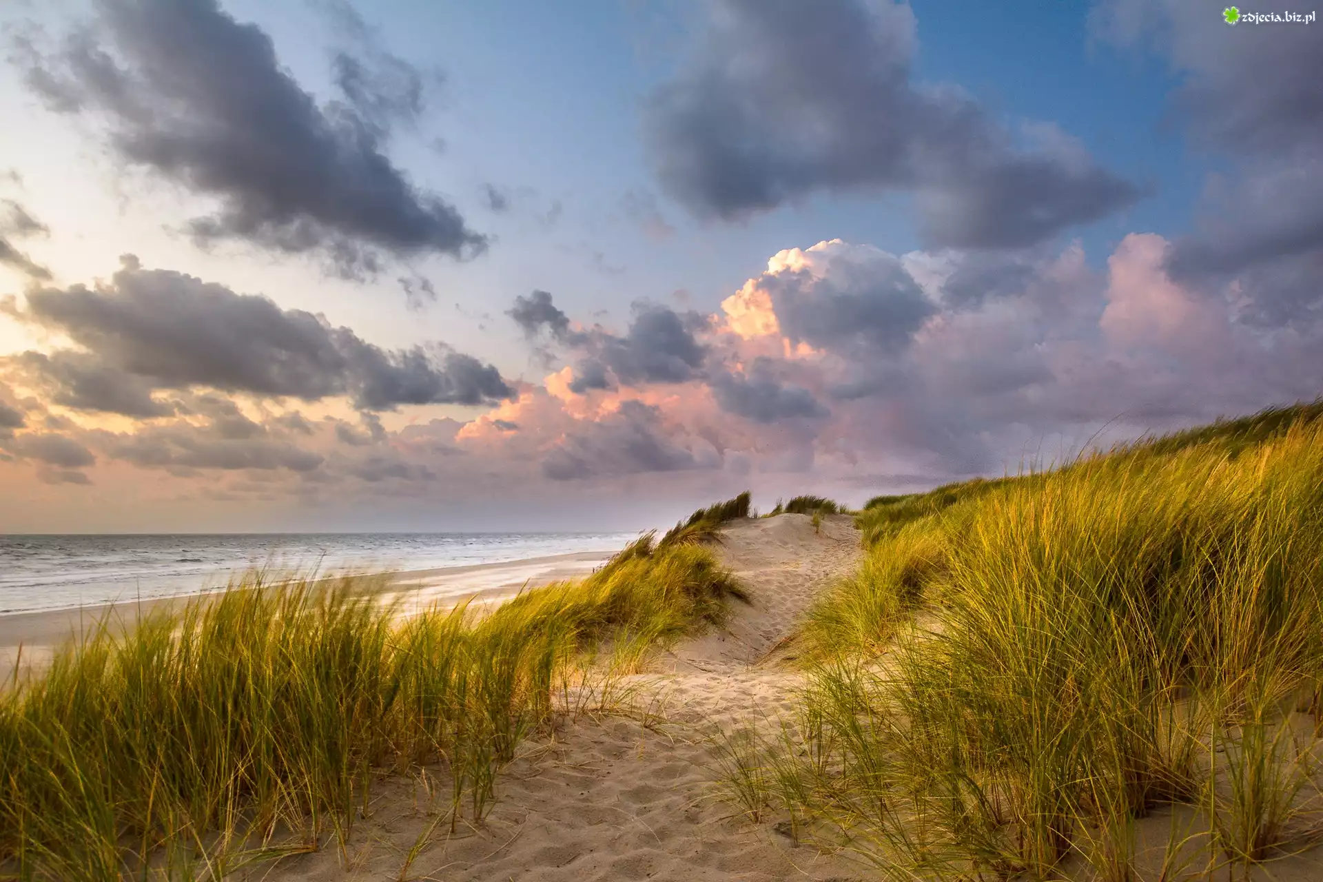 Zdjęcie Wydmy, Trawa, Plaża, Morze, Chmury, Zachód słońca, Normandia, Francja