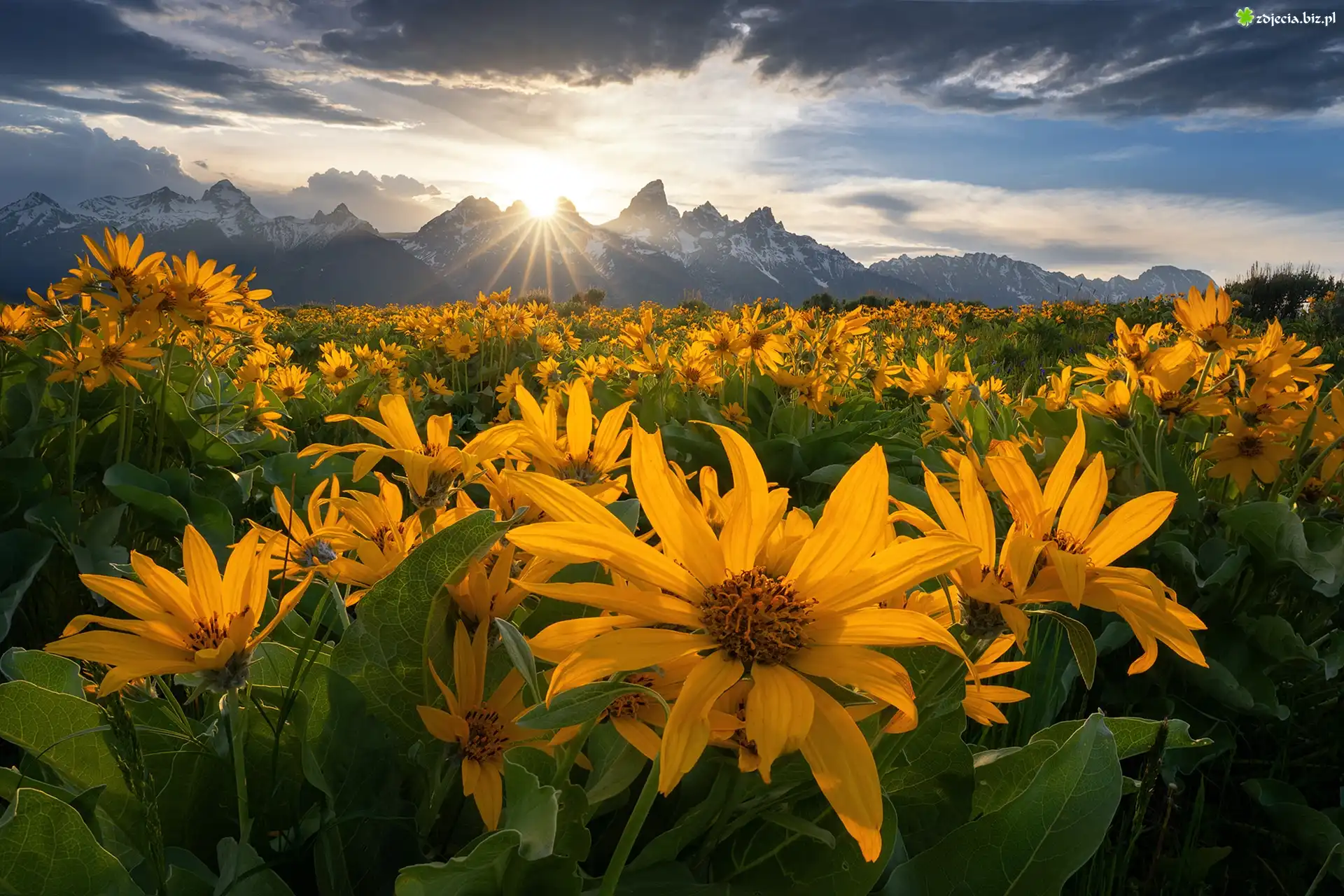 Zdjęcie Stany Zjednoczone, Stan Wyoming, Park Narodowy Grand Teton, Góry, Łąka, Kwiaty, Balsamorhiza, Chmury |