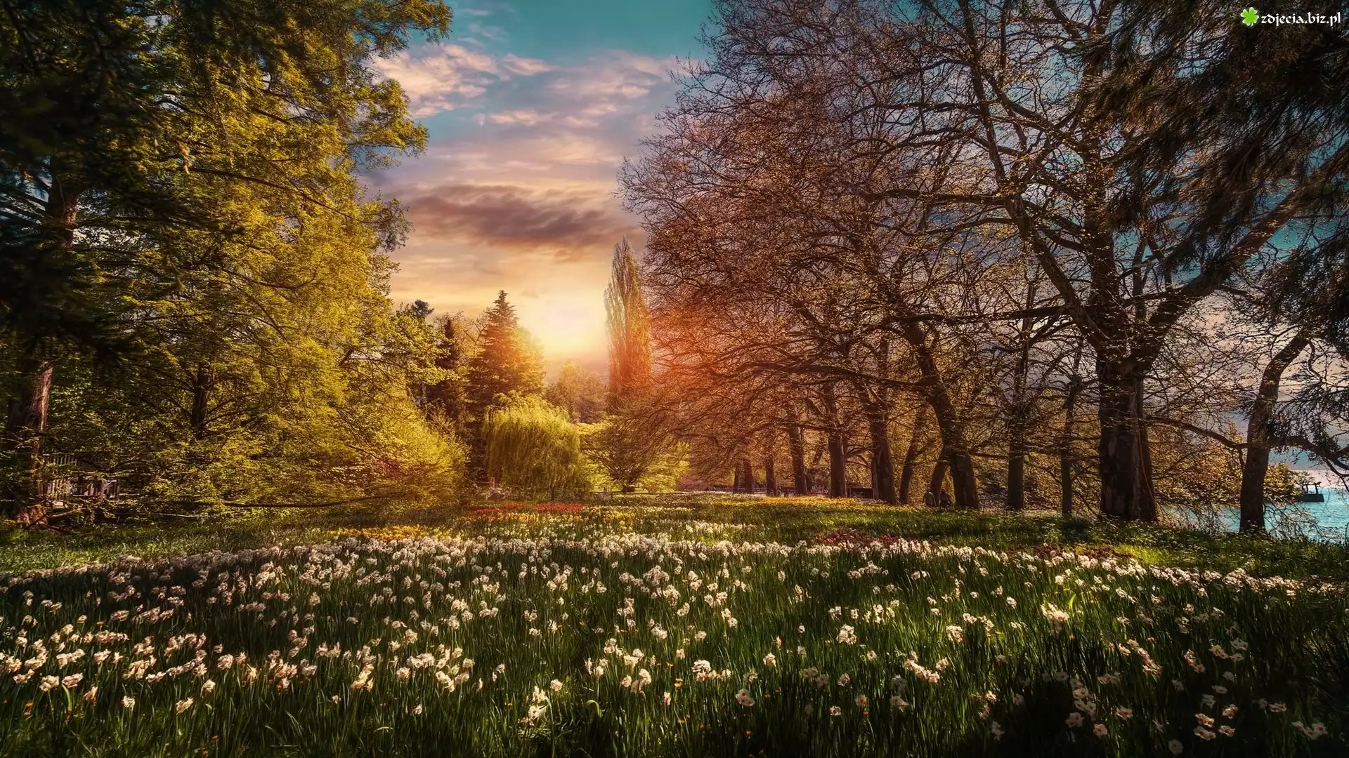 Zdjęcie Park, Ogród, Wyspa Mainau, Badenia-Wirtembergia, Niemcy, Kwiaty, Drzewa, Wschód słońca