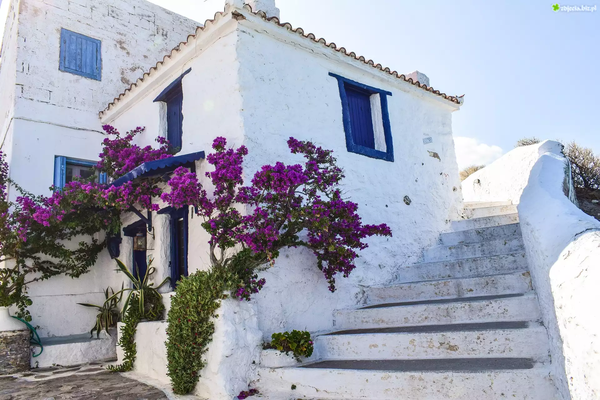 Zdjęcie Grecja, Wyspa Skopelos, Dom, Schody, Krzew, Kwiaty, Bugenwilla