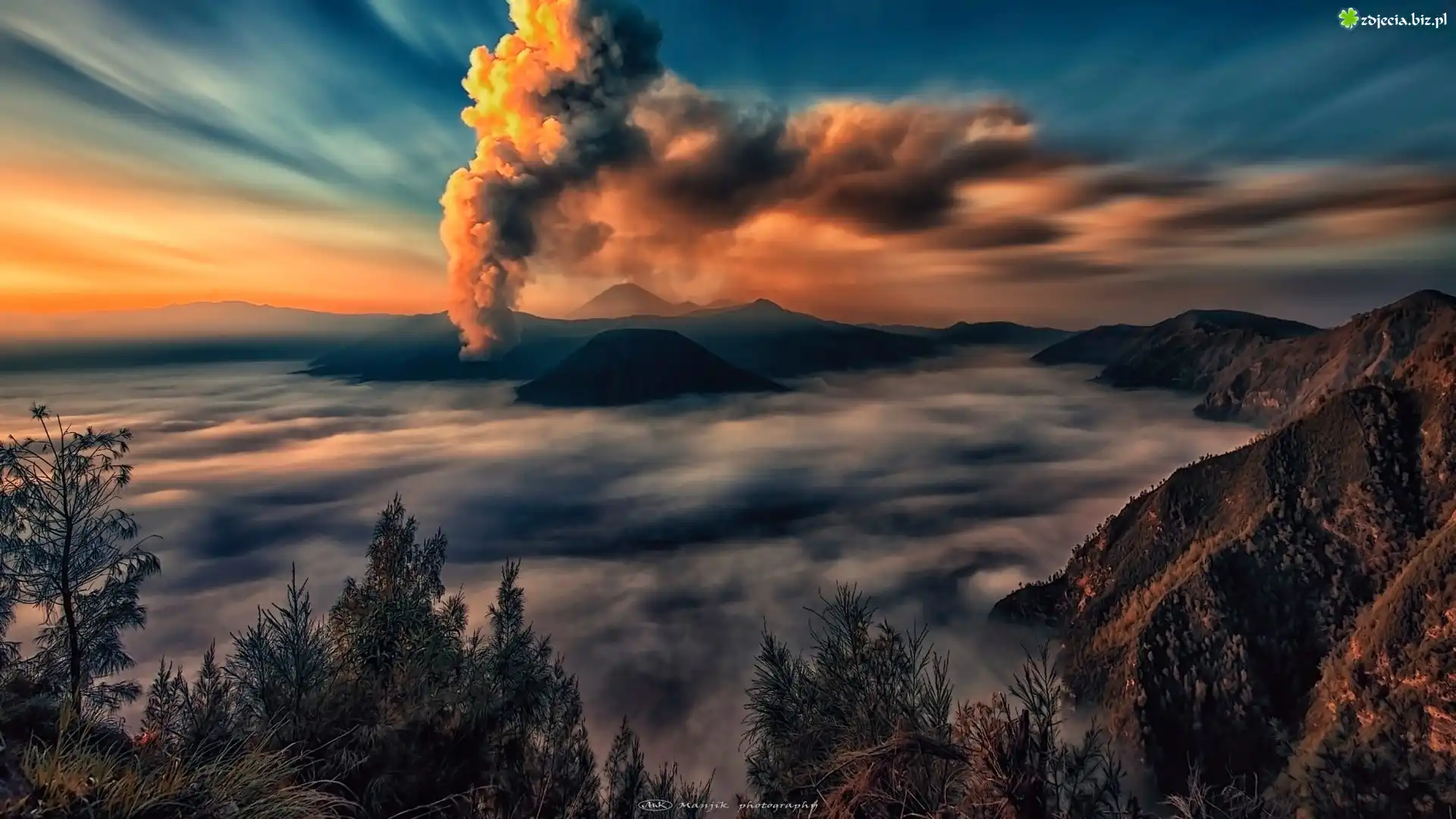 Zdjęcie Indonezja, Wyspa Jawa, Wulkan Bromo, Góry, Drzewa, Chmury
