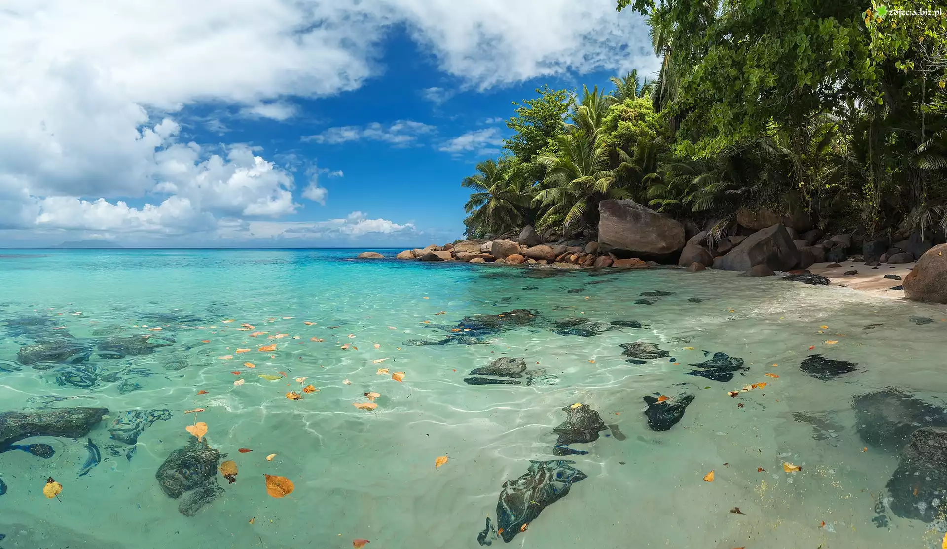 Zdjęcie Seszele, Wyspa Mahe, Morze, Głazy, Palmy, Roślinność, Chmury