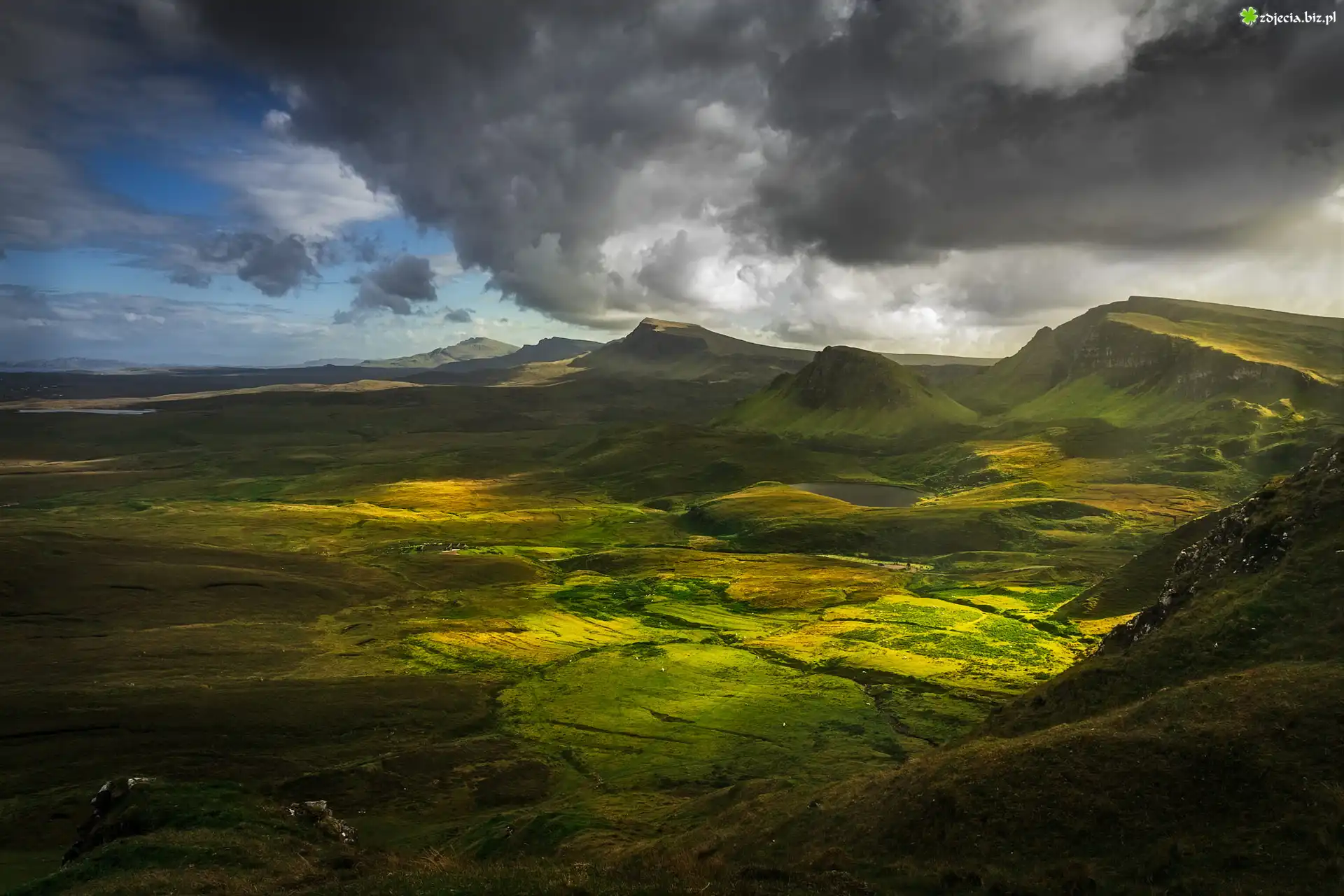 Zdjęcie, Szkocja, Wyspa Skye, Półwysep Trotternish, Wzgórza, Ciemne, Chmury