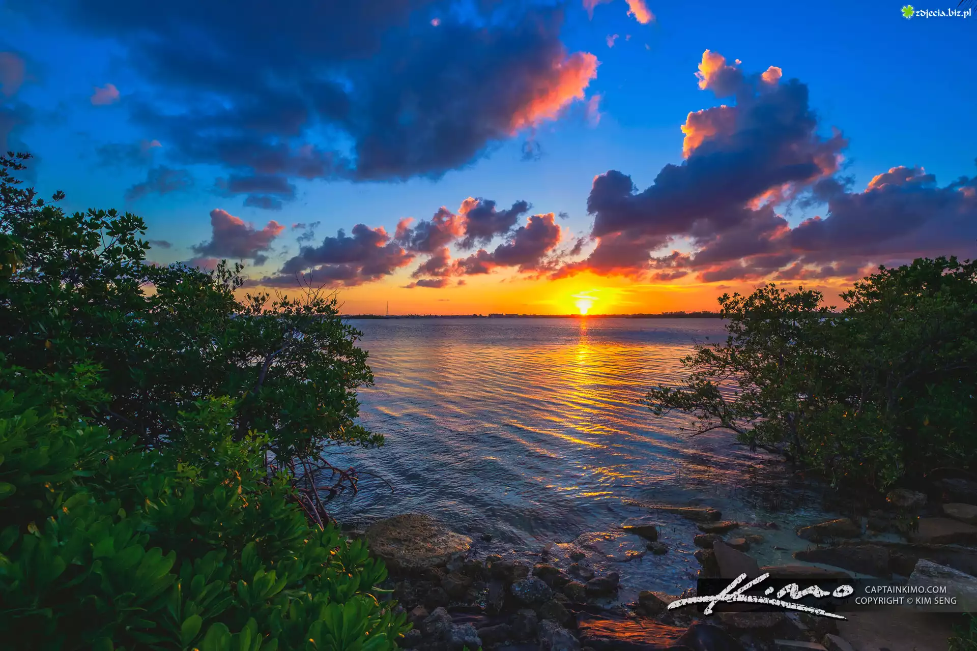 Zdjęcie Stany Zjednoczone, Floryda, Wyspa Singera, Jezioro Worth Laguna, Drzewa, Kamienie, Zachód słońca, Chmury |