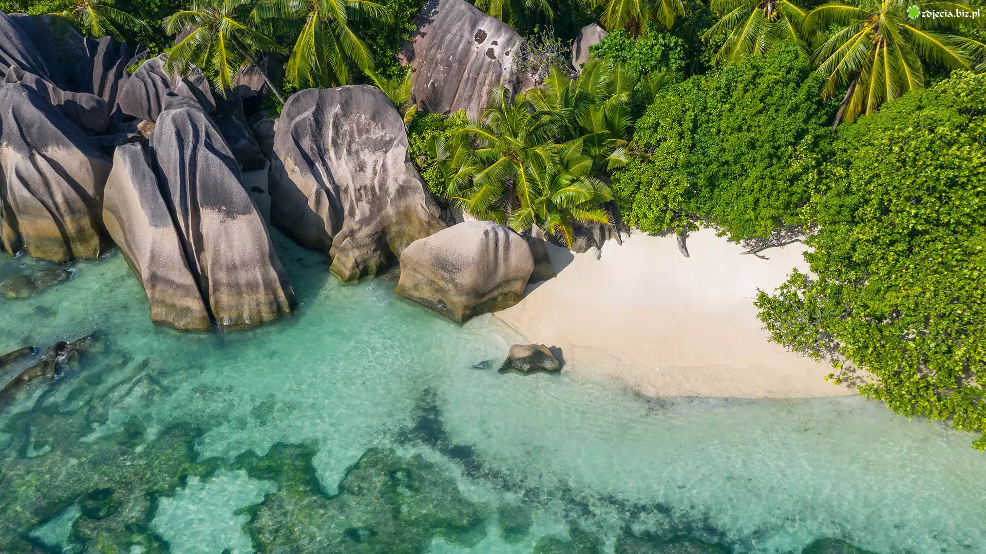 Zdjęcie Wyspa, Seszele, Wyspa La Digue, Morze, Skały, Głazy, Plaża, Roślinność