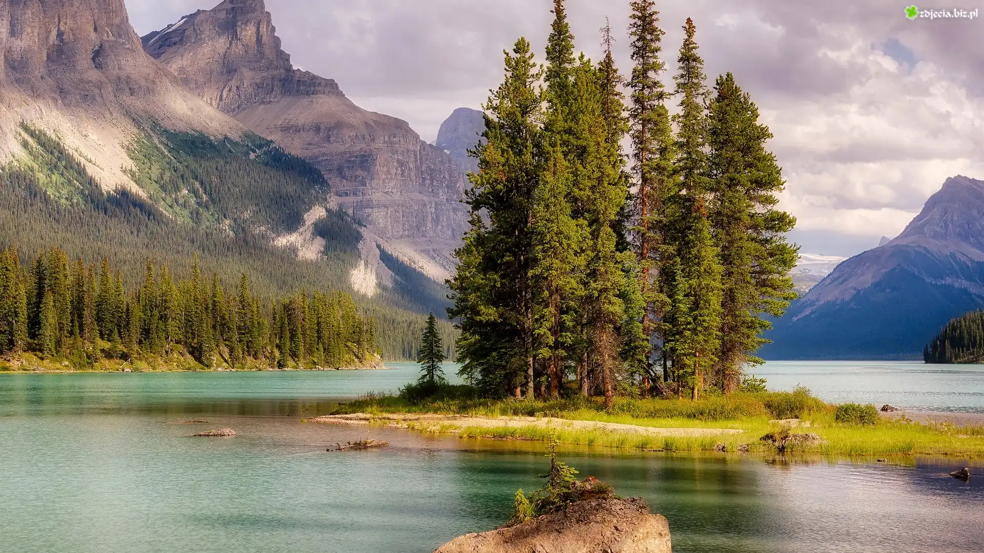 Zdjęcie Wyspa Ducha, Wyspa Spirit Island, Jezioro Maligne, Park Narodowy Jasper, Kanada, Góry, Drzewa |