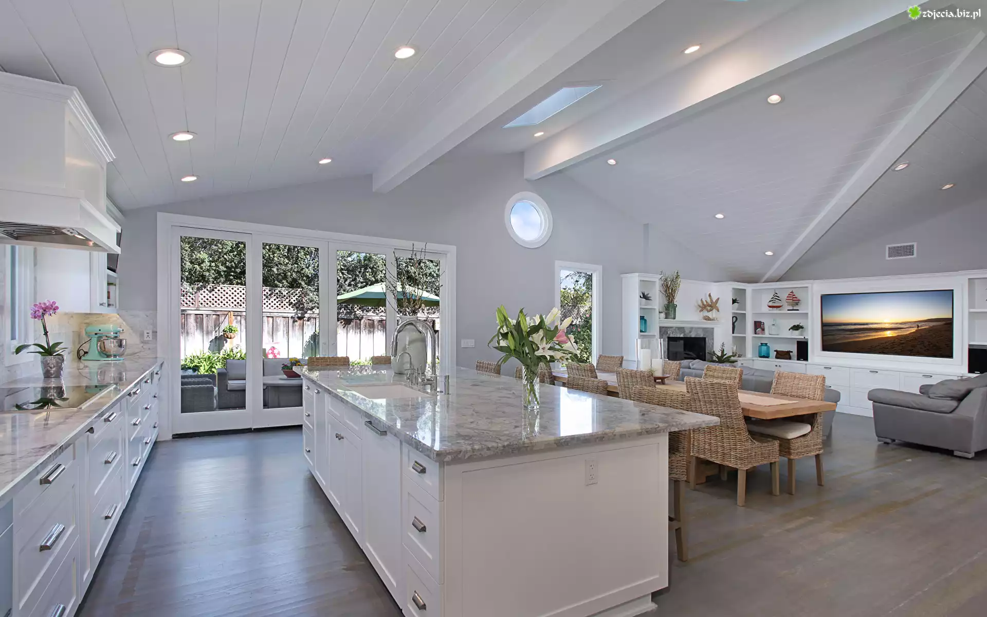 Zdjęcie Kuchnia, Wyspa kuchenna, Stół, Krzesła ratanowe, Kanapa, Telewizor