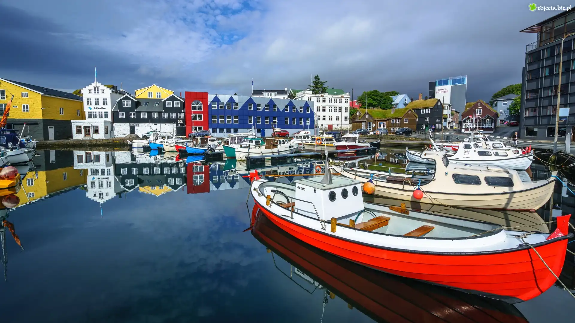 Zdjęcie Dania, Wyspy Owcze, Thorshavn, Motorówki, Przystań, Kolorowe, Domy