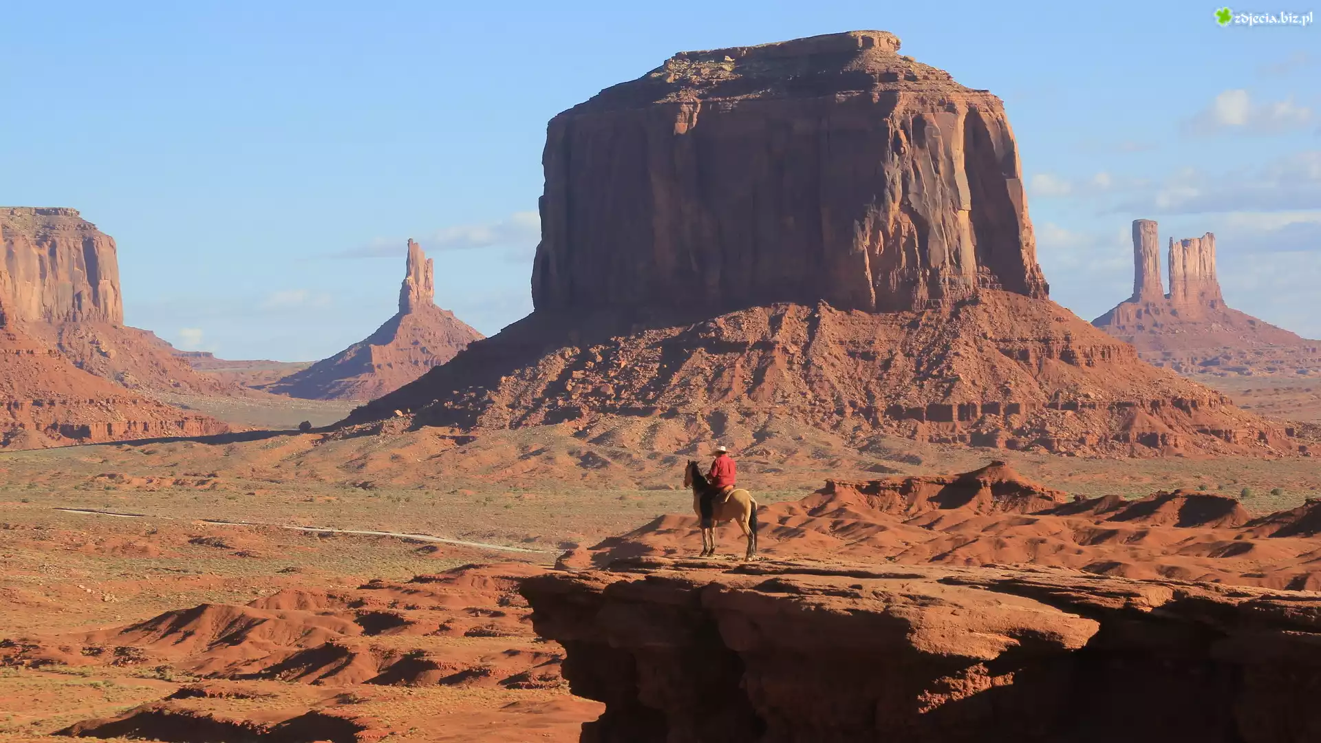 Zdjęcie Wyżyna Kolorado, Rezerwat Indian Navaho, Dolina Skał, Monument Valley, Skały, Jeździec, Koń, Stan Utah, Stany Zjednoczone |