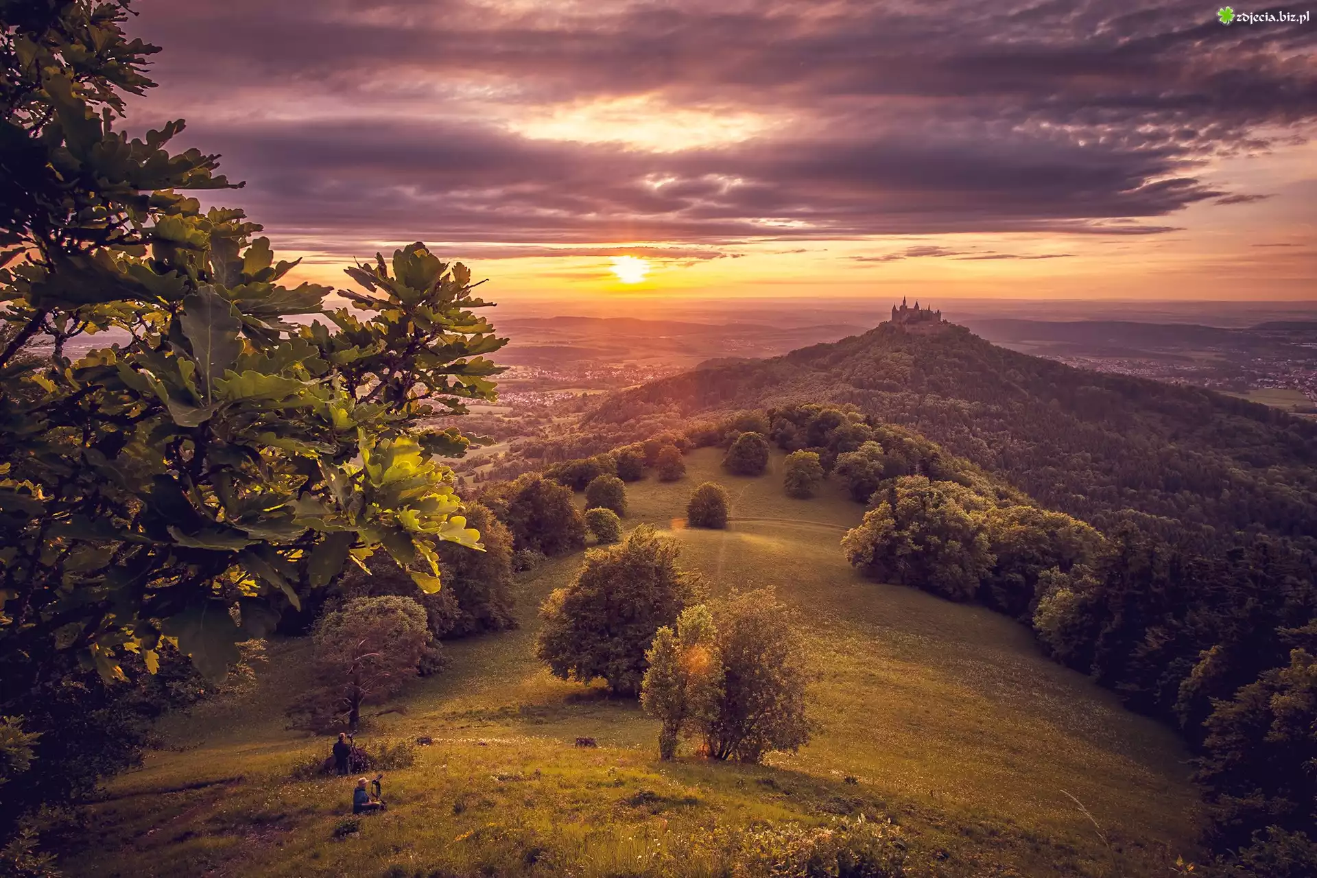 Zdjęcie, Niemcy, Wzgórza, Zamek Hohenzollern, Drzewa, Wschód słońca, Chmury
