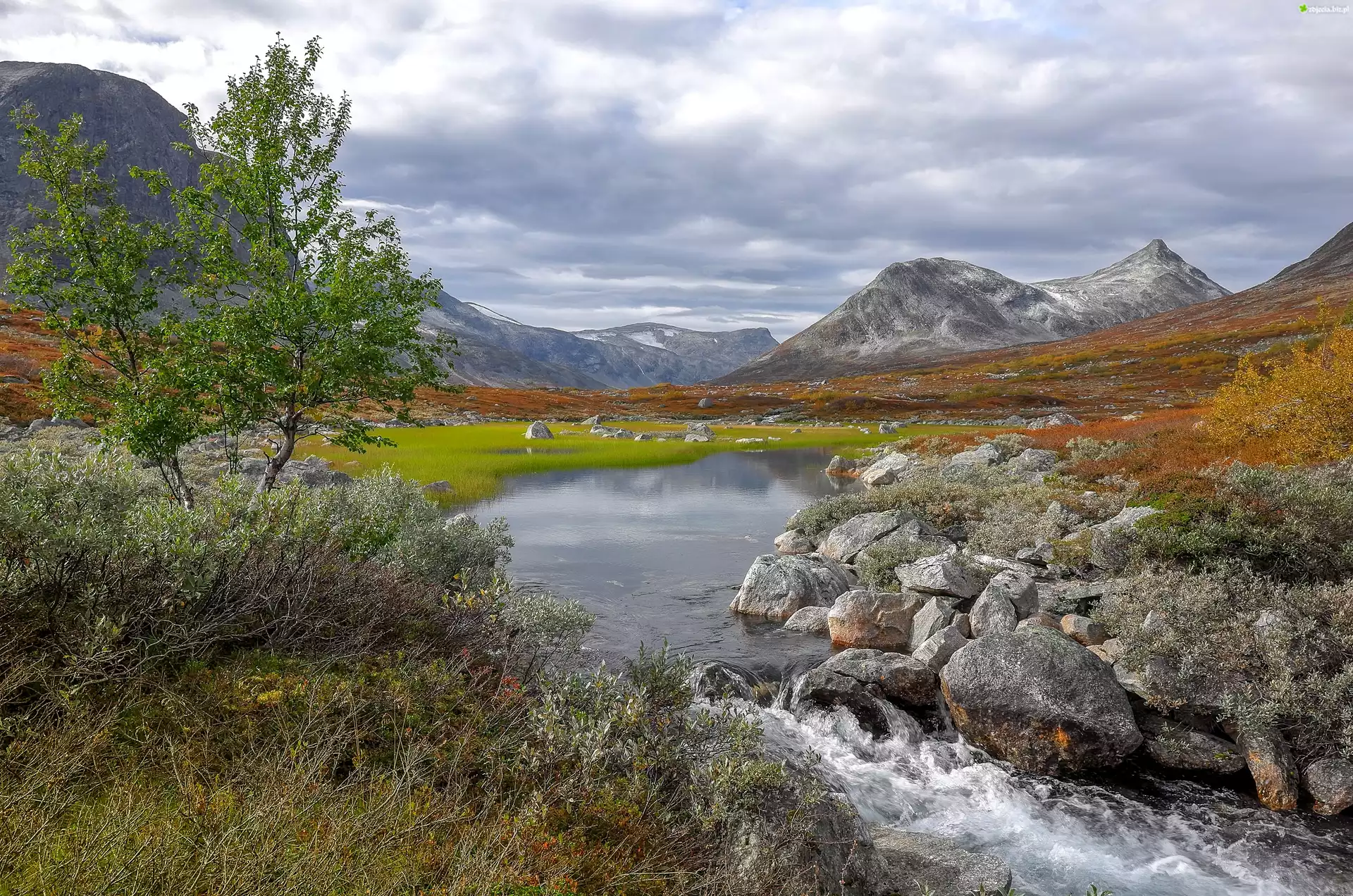 Zdjęcie, Norwegia, Rezerwat przyrody Vermedalen, Wzgórza, Kamienie, Rzeczka, Drzewo, Góry