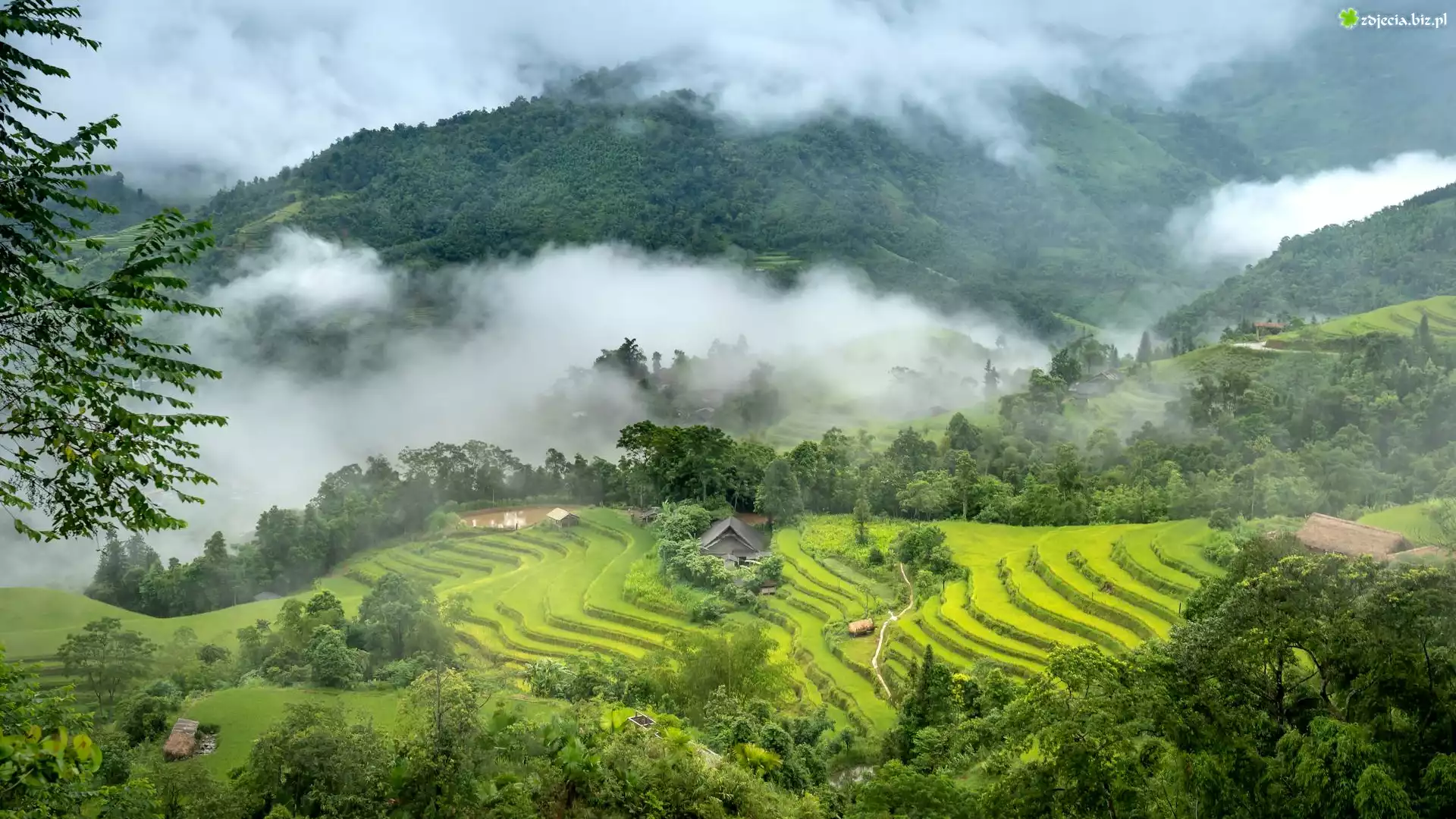Zdjęcie Góry, Mgła, Pola uprawne, Tarasy ryżowe, Drzewa, Wzgórza