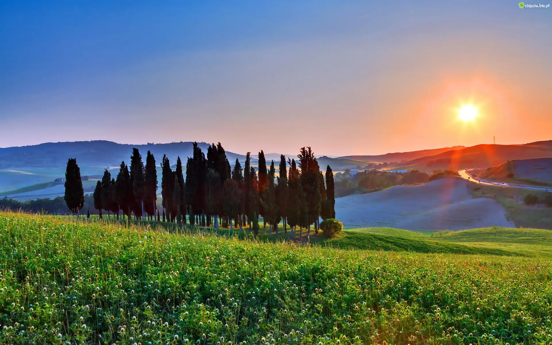 Zdjęcie Wzgórza, Łąki, Drzewa, Zachód, Słońca