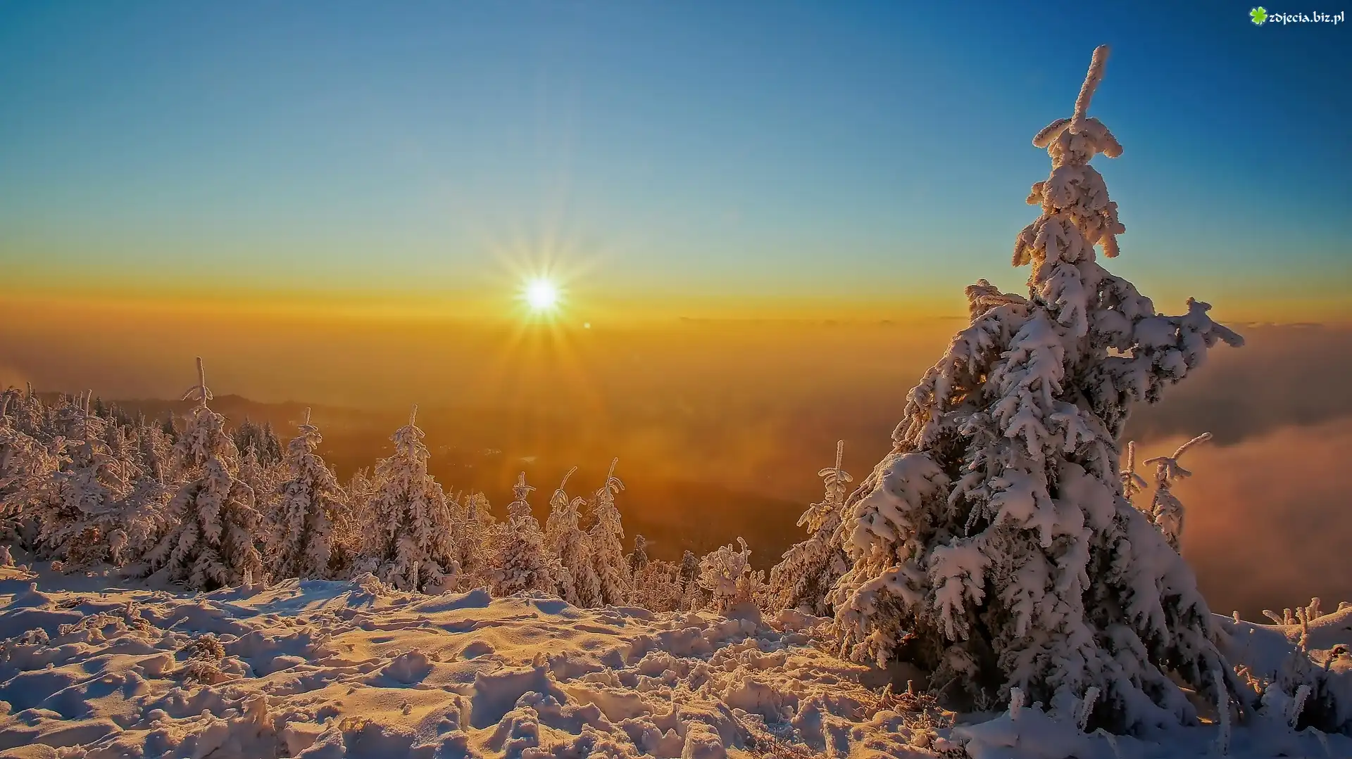 Zdjęcie Zima, Wzgórza, Ośnieżone, Drzewa, Śnieg, Wschód słońca