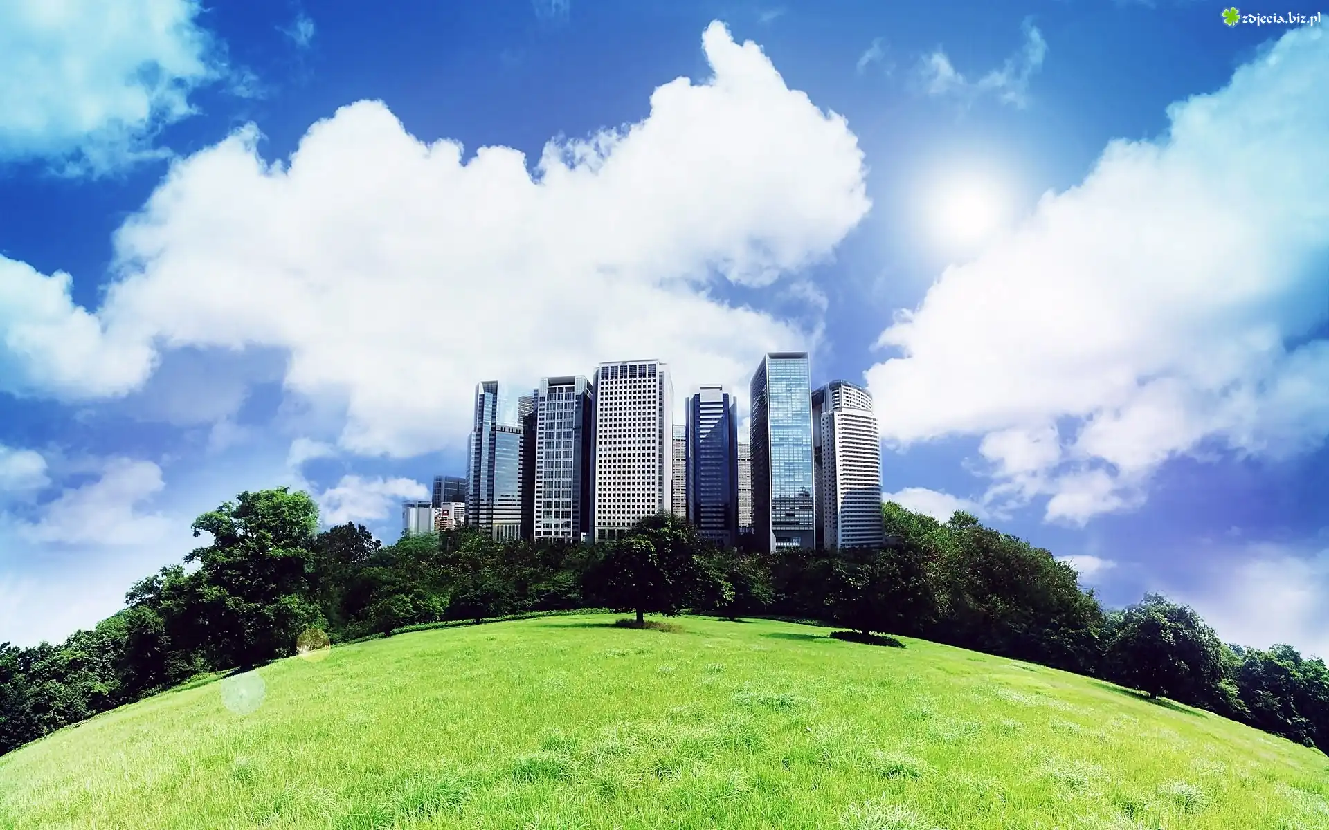 Zdjęcie Wzgórze, Drzewa, Trawnik, Drapacze, Chmur