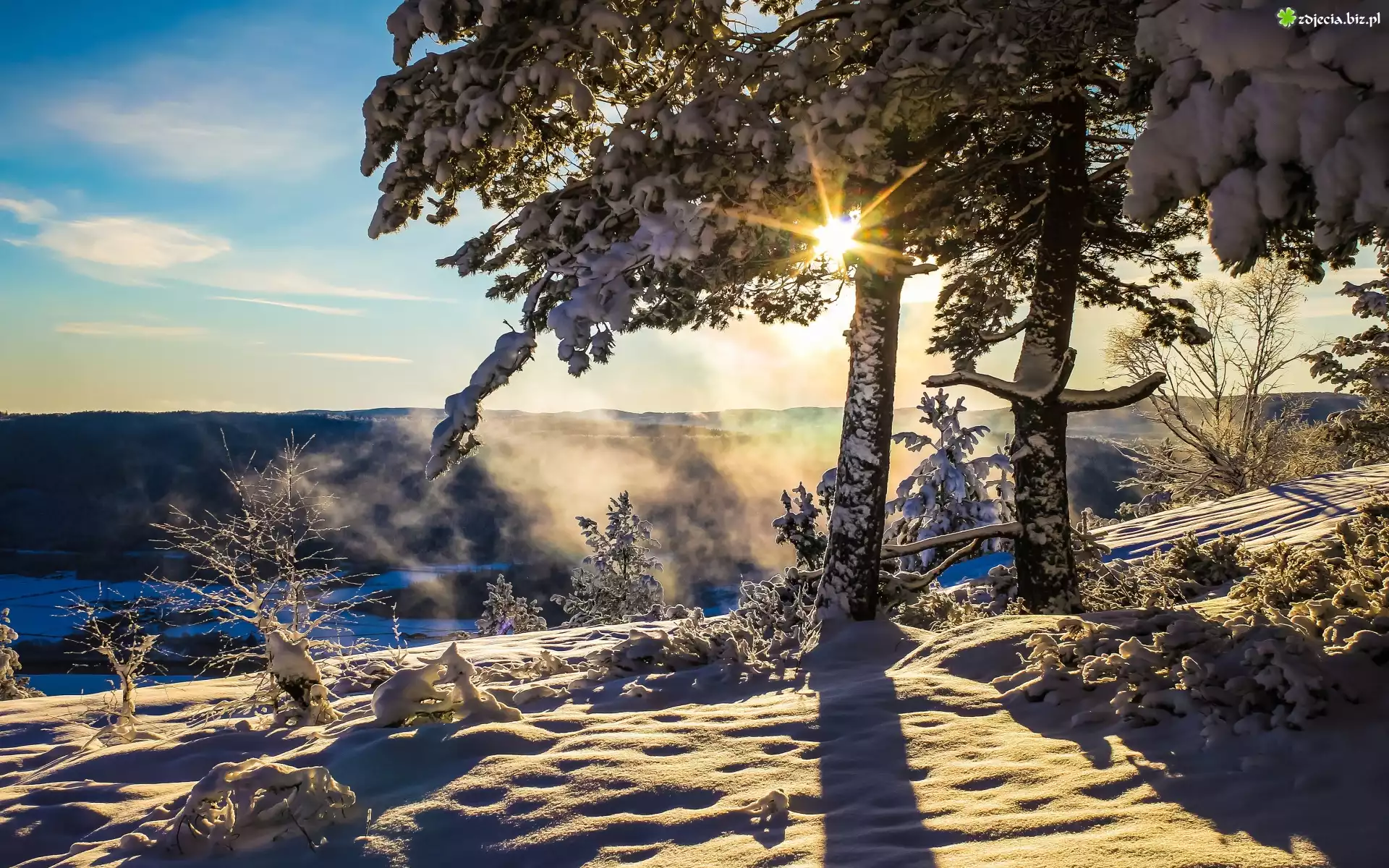 Zdjęcie Zima, Śnieg, Drzewa, Krzewy, Poranek, Promienie słońca, Mgła, Wzgórze