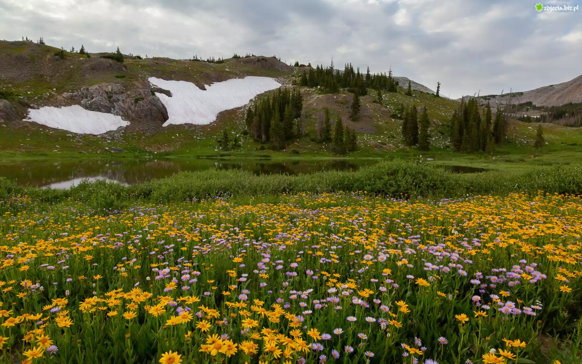 Zdjęcie Góry, Wzgórze, Jezioro, Łąka, Kwiaty, Drzewa, Chmury