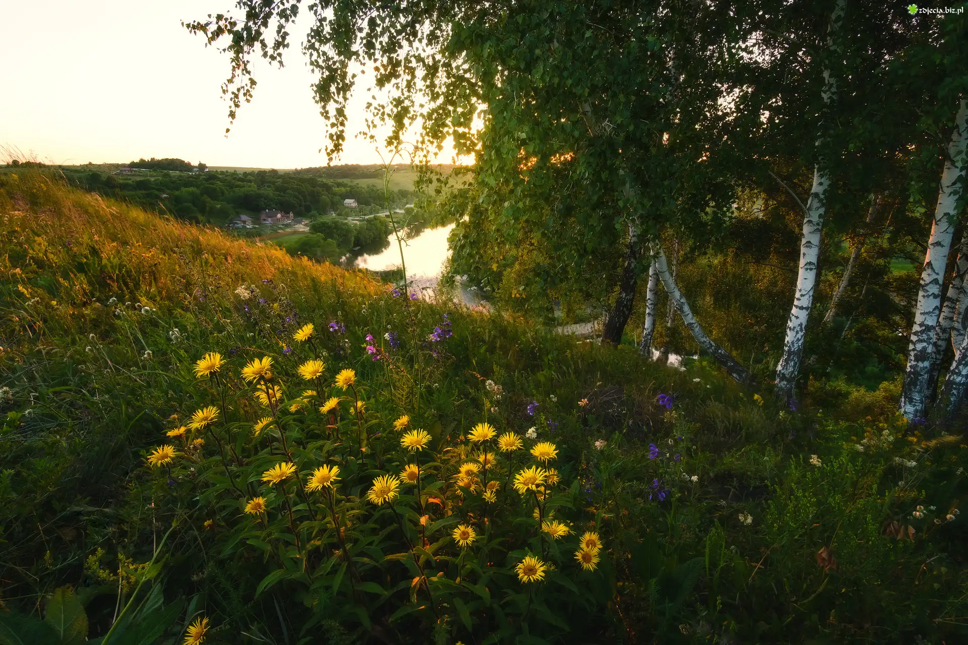 Zdjęcie Lato, Żółte, Kwiaty, Drzewa, Brzozy, Wzgórze, Rzeka Krasivaya Mecha, Obwód tulski, Rosja
