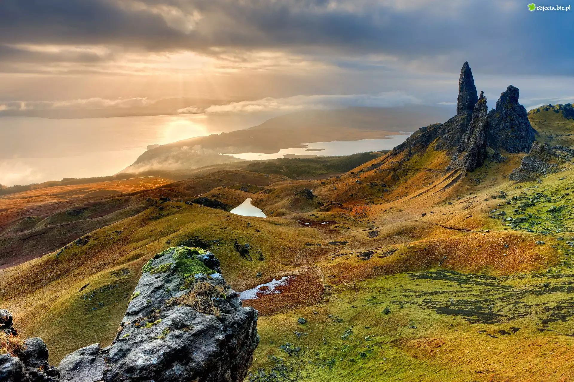 Zdjęcie Szkocja, Wyspa Skye, Morze, Doliny, Wzgórze The Storr, Skały, Jezioro, Wschód słońca
