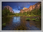 Zdjęcie Stany Zjednoczone, Kalifornia, Park Narodowy Yosemite, Góry, Rzeka Merced, Drzewa, Człowiek, Odbicie |