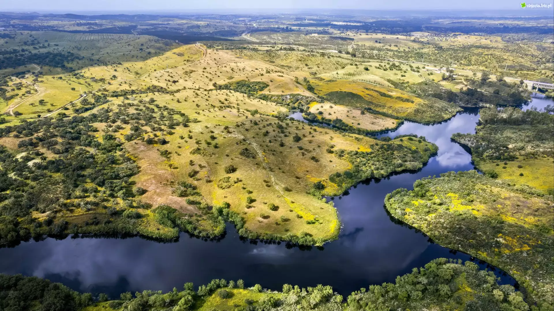 Zdjęcie Rzeka, Wzgórza, Drzewa, Z lotu ptaka
