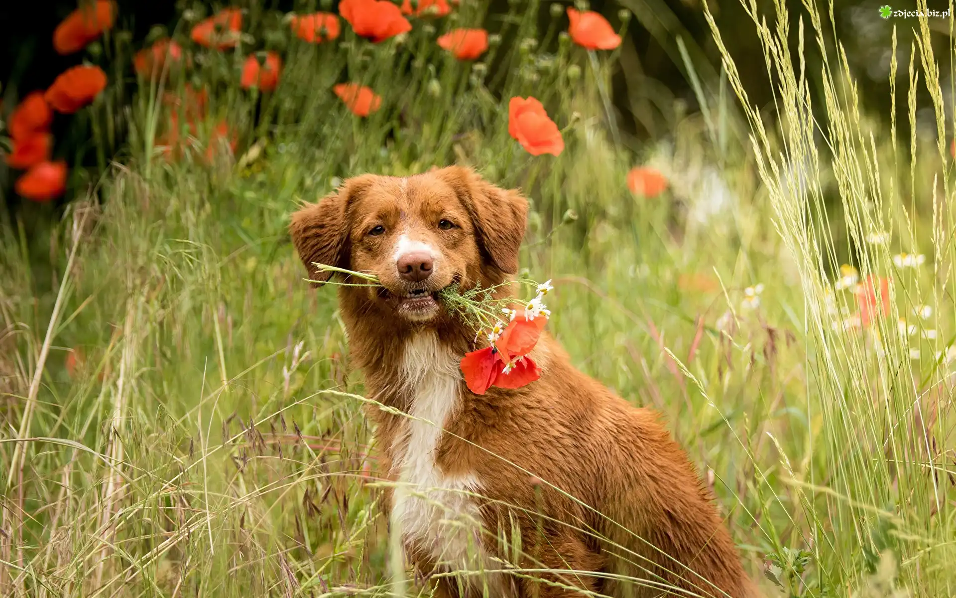 Zdjęcie Pies, Retriever z Nowej Szkocji, Maki, Trawa Retriever z Nowej Szkocji