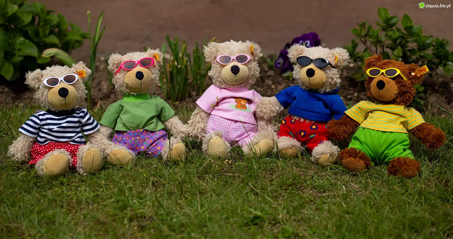 Zdjęcie, Zabawki, Misie, Pluszaki, Ubranka, Okulary, Trawa