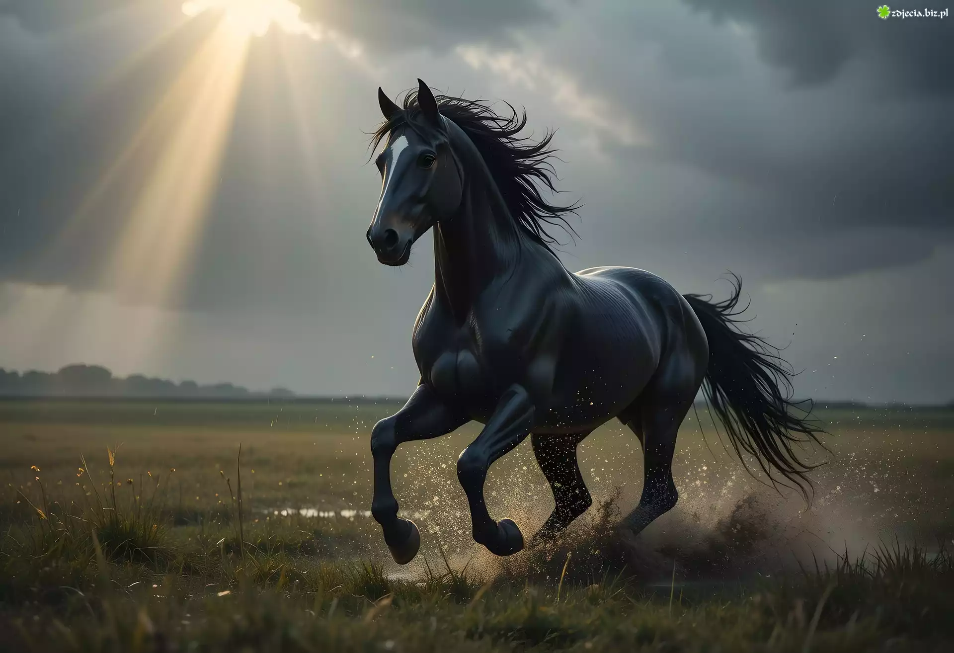 Zdjęcie Czarny, Koń, Mokradła, Zachmurzenie, Niebo, Grafika