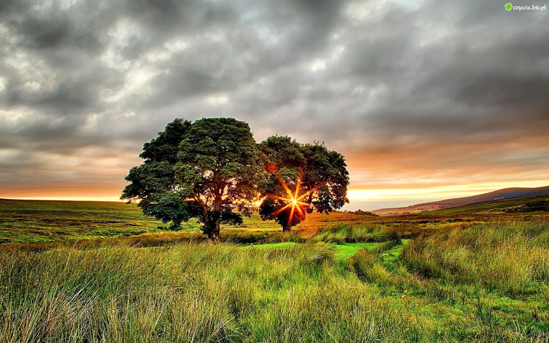 Zdjęcie Zachmurzone, Niebo, Pola, Drzewa, Zachód Słońca