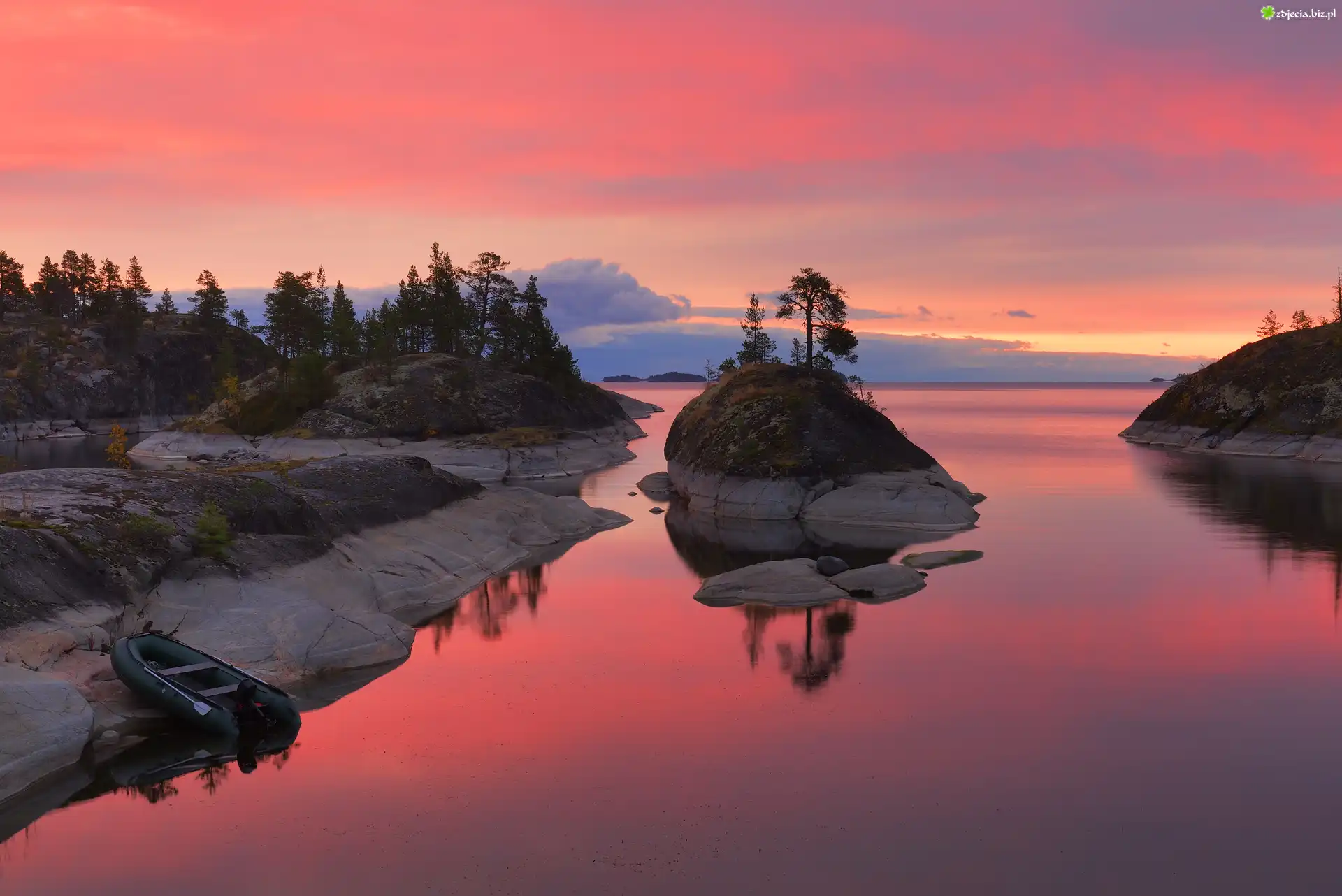 Zdjęcie Zachód słońca, Jezioro, Ładoga, Wysepka, Skały, Kamienie, Ponton, Odbicie, Drzewa, Chmury, Karelia, Rosja |