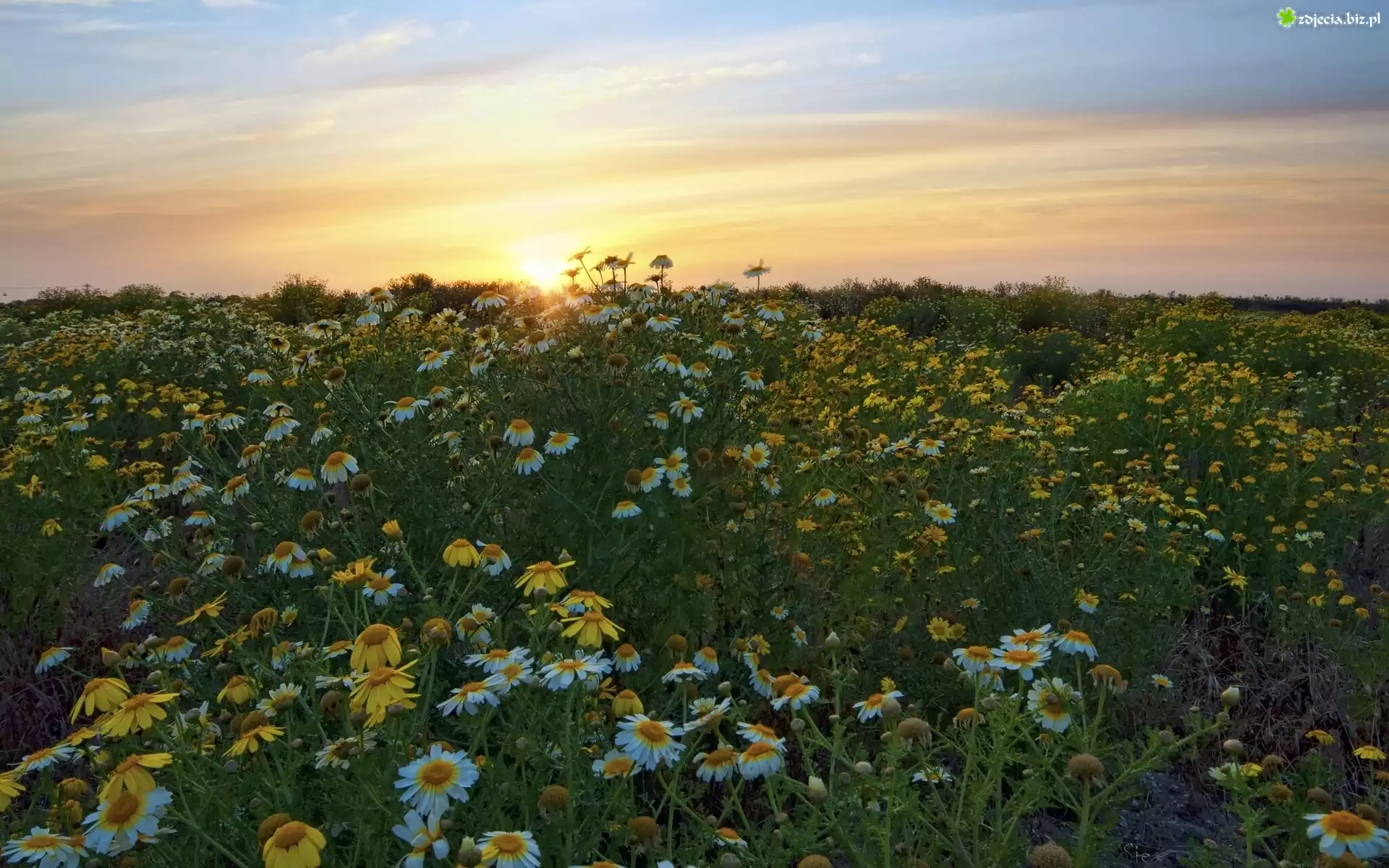 Zdjęcie Zachód, Słońca, Łąka, Kwiaty
