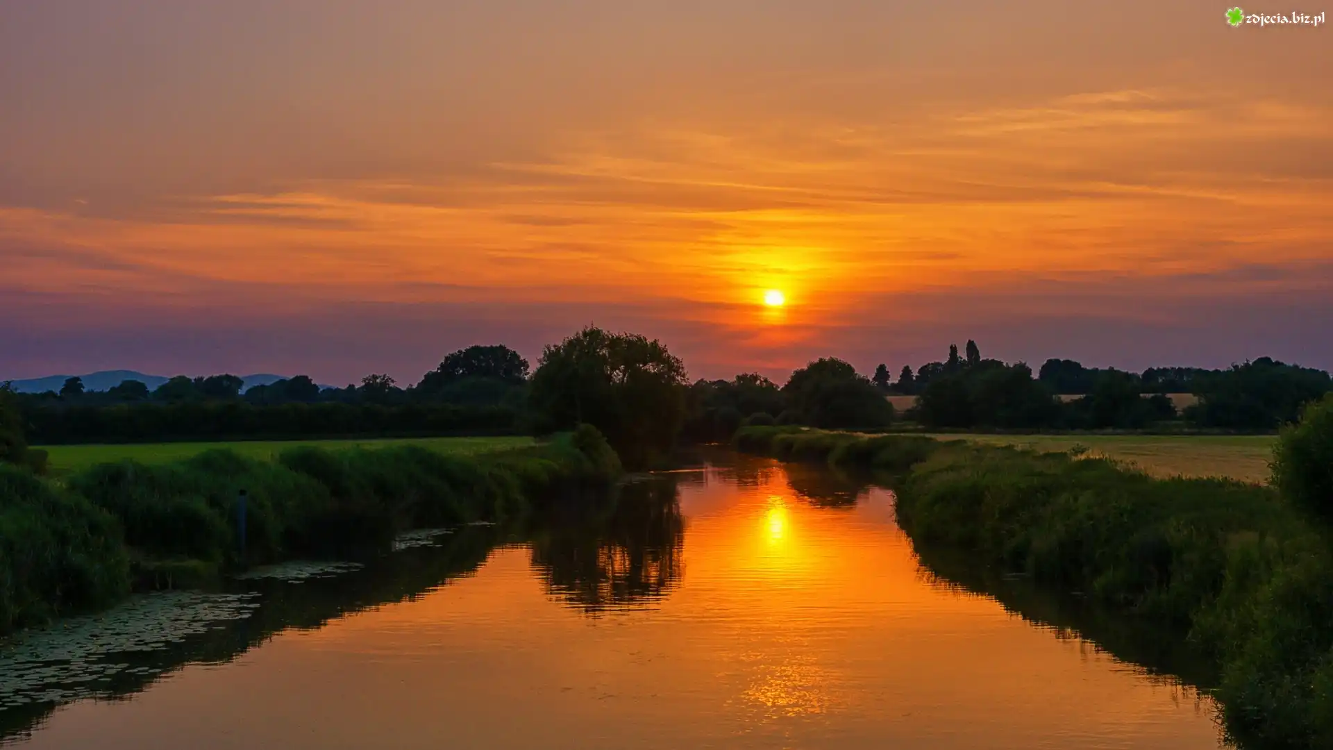 Zdjęcie Zachód, Słońca, Rzeka, Łąki, Drzewa