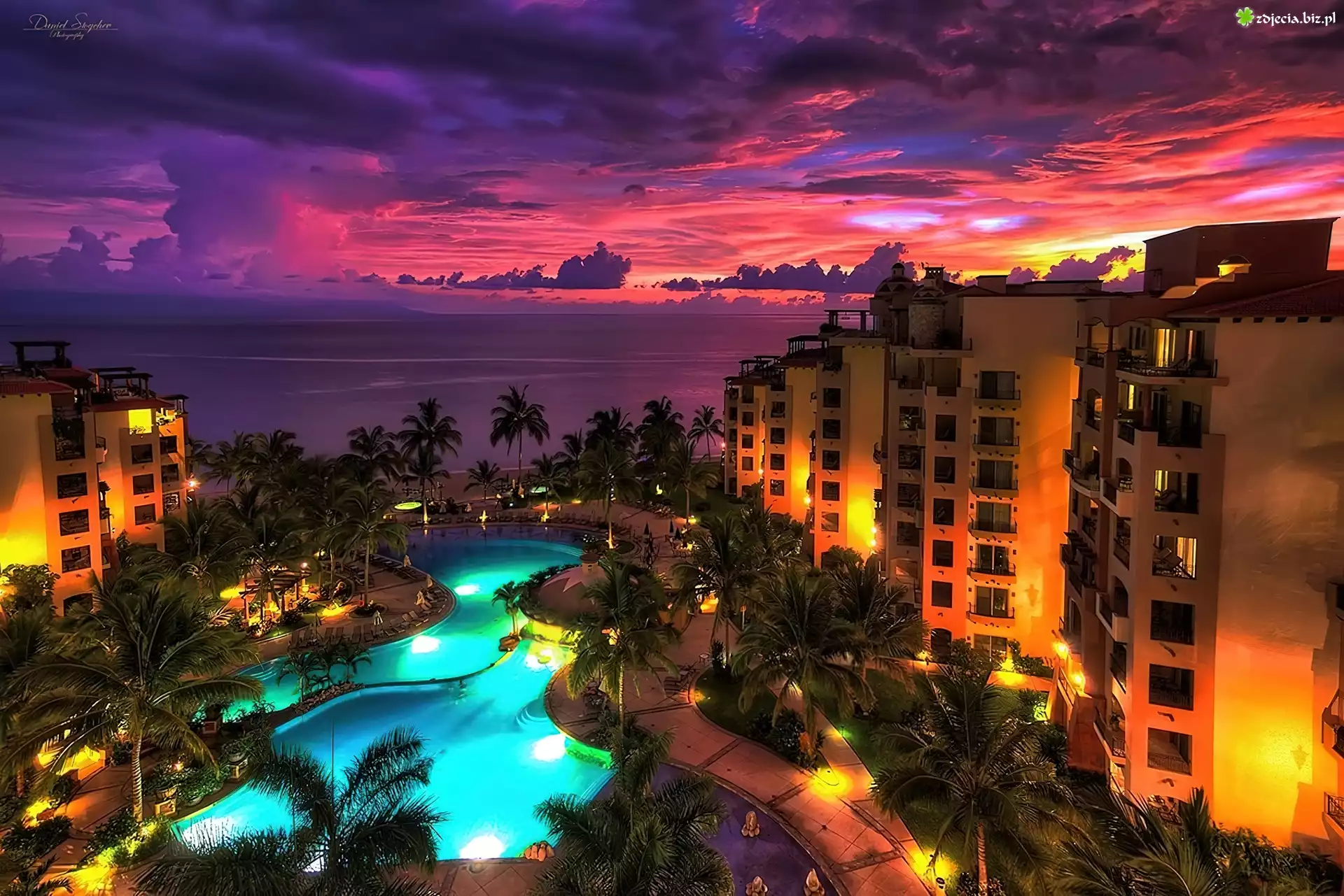 Zdjęcie Zachód, Słońca, Osiedle, Basen, Palmy