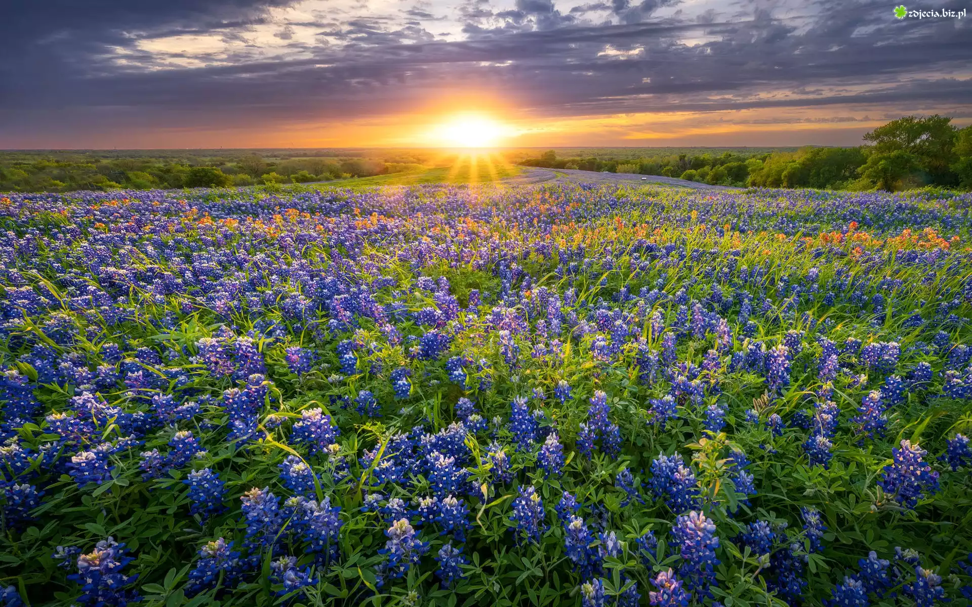 Zdjęcie Łubin, Łąka, Drzewa, Zachód słońca, Chmury