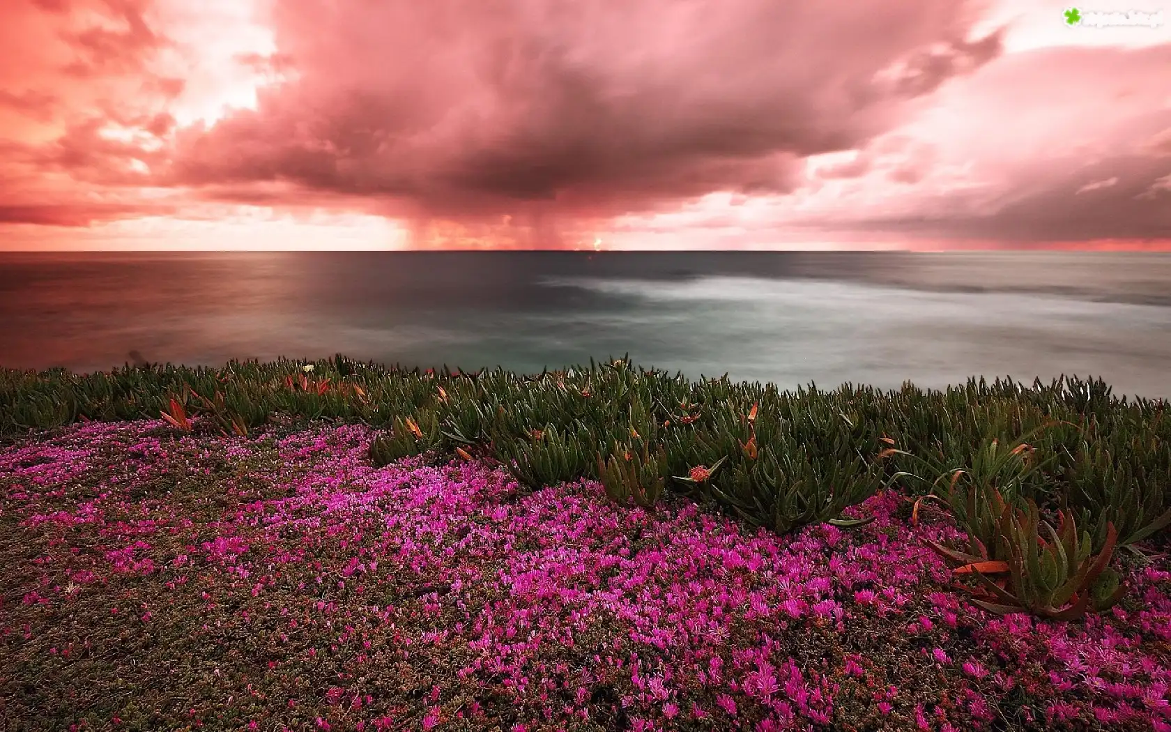 Zdjęcie Zachód, Słońca, Różowe, Chmury, Kwiatki