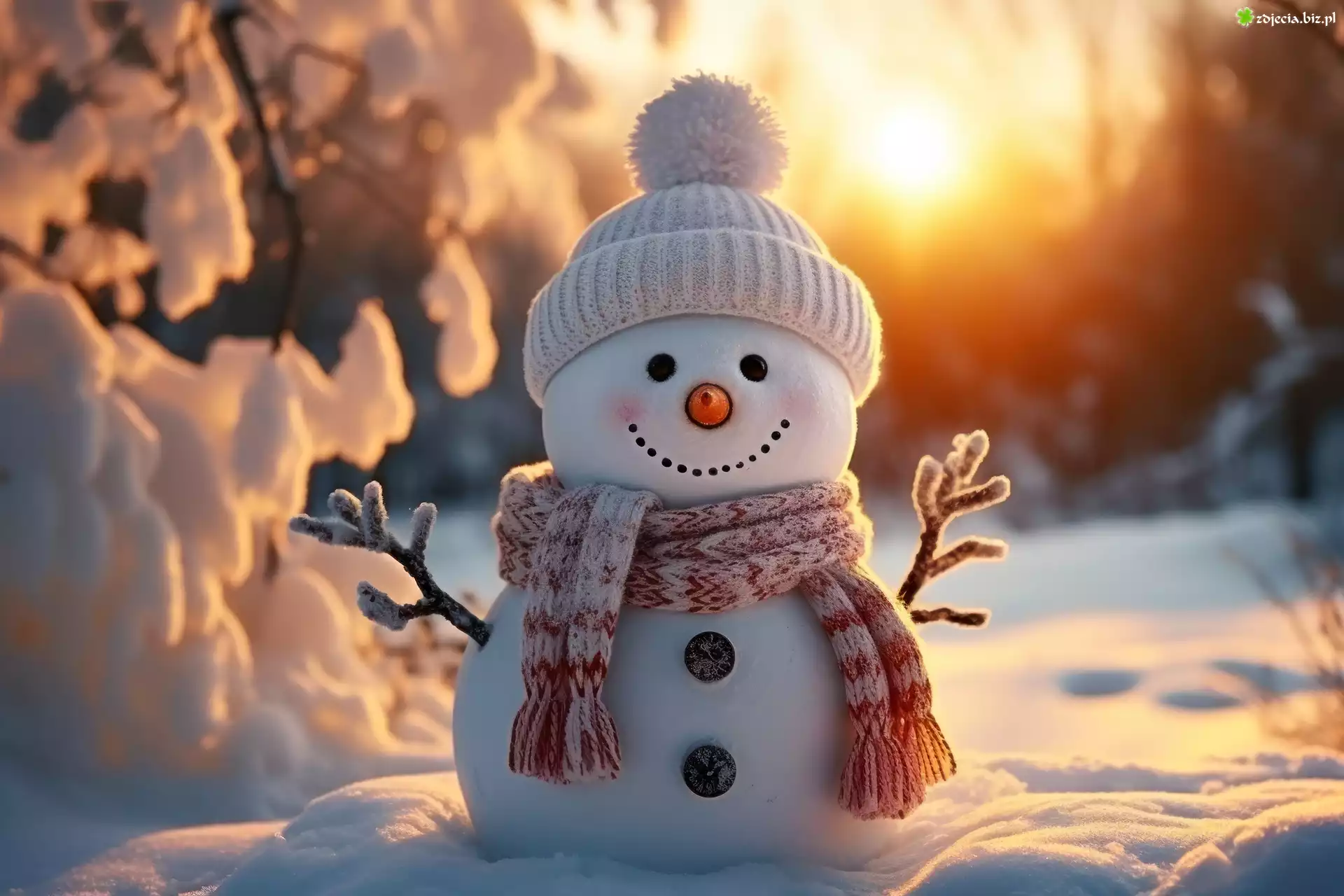 Zdjęcie Bałwanek, Szalik, Czapka, Zachód słońca, Grafika AI