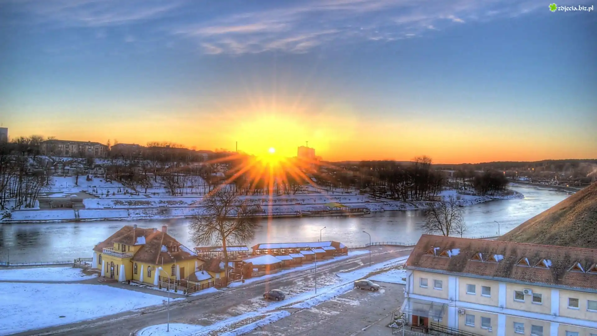 Zdjęcie Zachód, Słońca, Rzeka, Domy, Śnieg