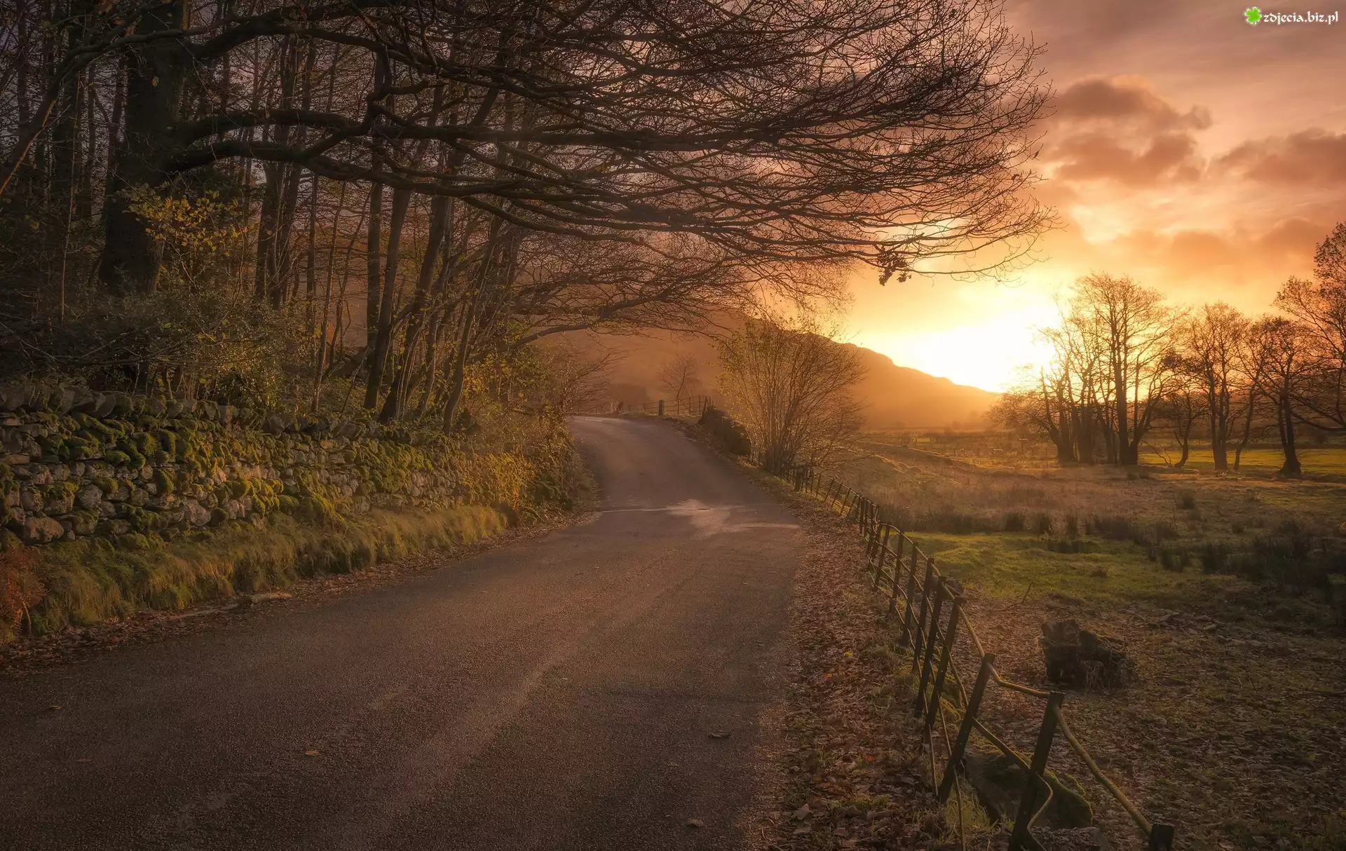 Zdjęcie Droga, Zachód słońca, Mur, Kamienie, Drzewa, Jesień