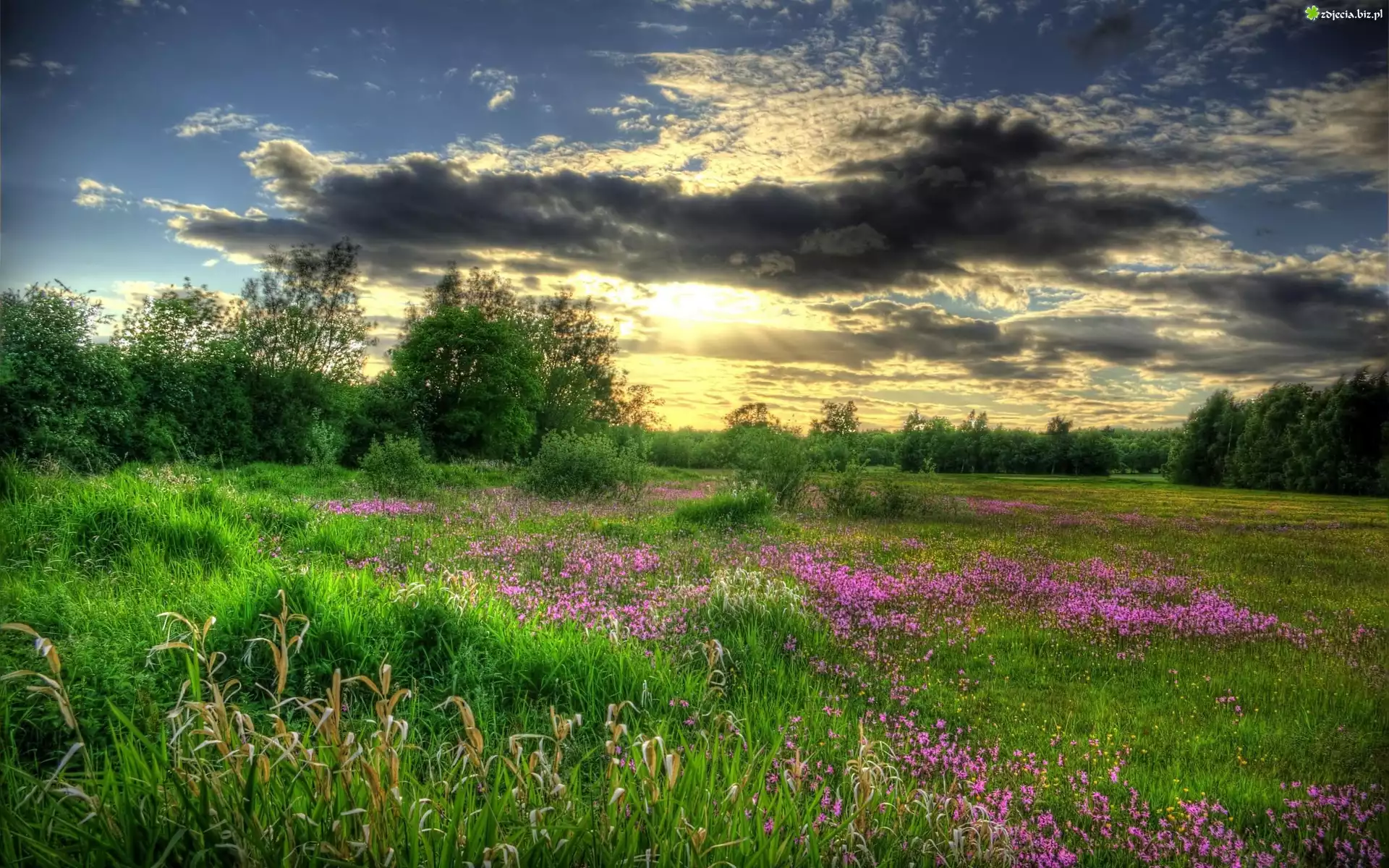 Zdjęcie Zachód, Słońca, Łąka, Drzewa, Kwiatki
