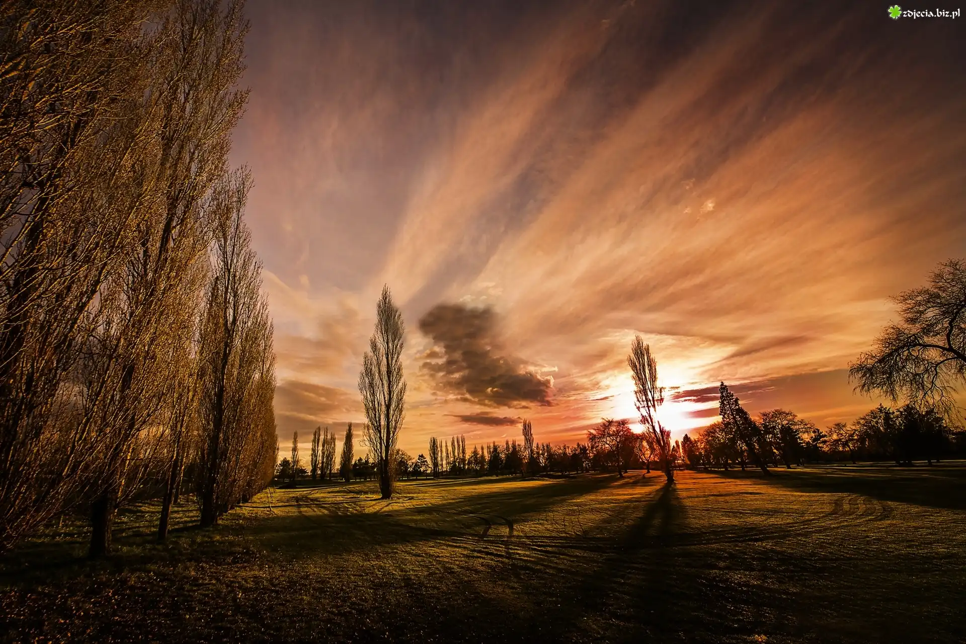 Zdjęcie, Zachód Słońca, Chmury, Drzewa, Łąka