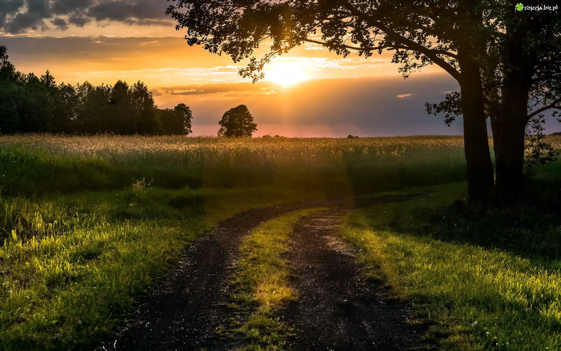 Zdjęcie Zachód, Słońca, Droga, Drzewa, Pola